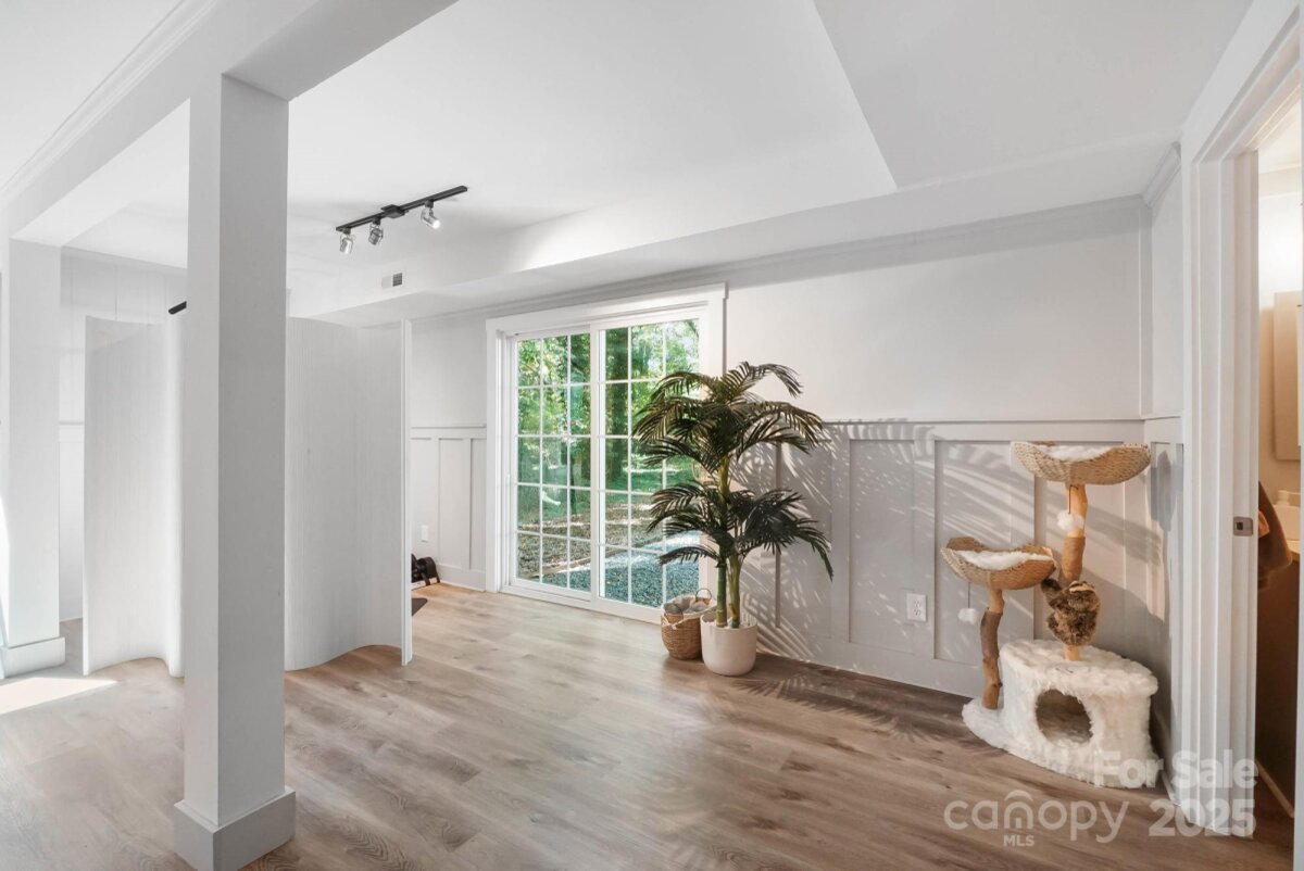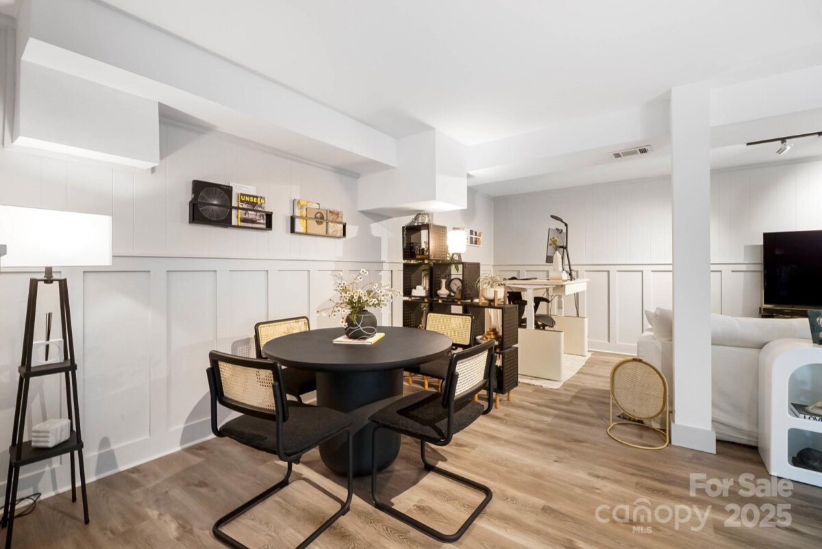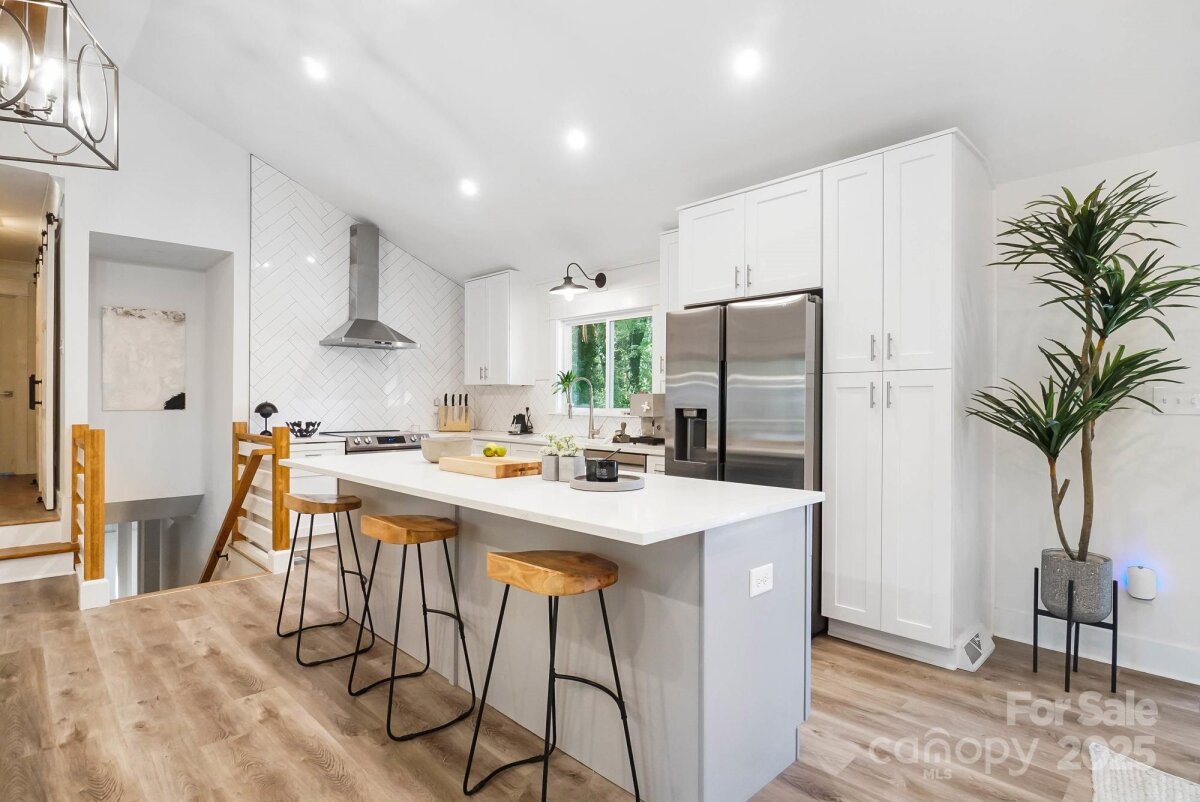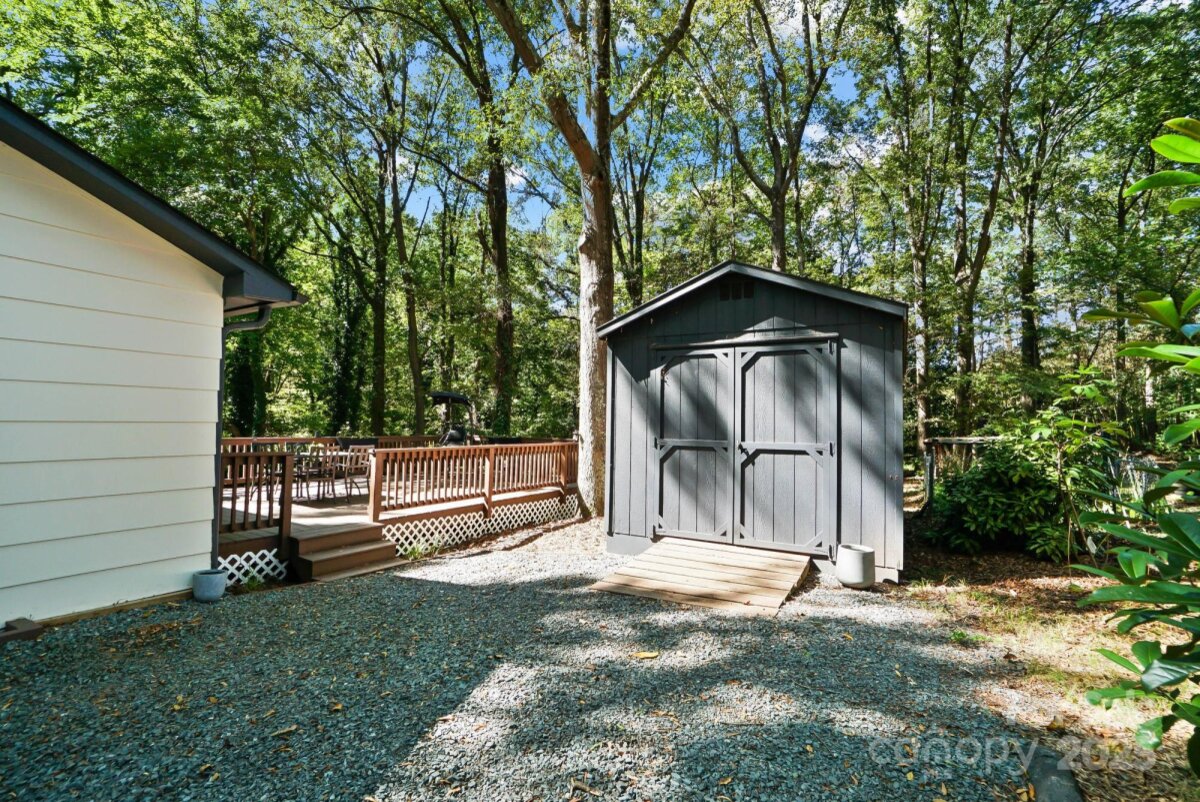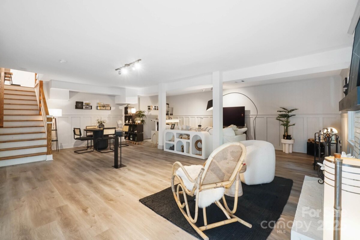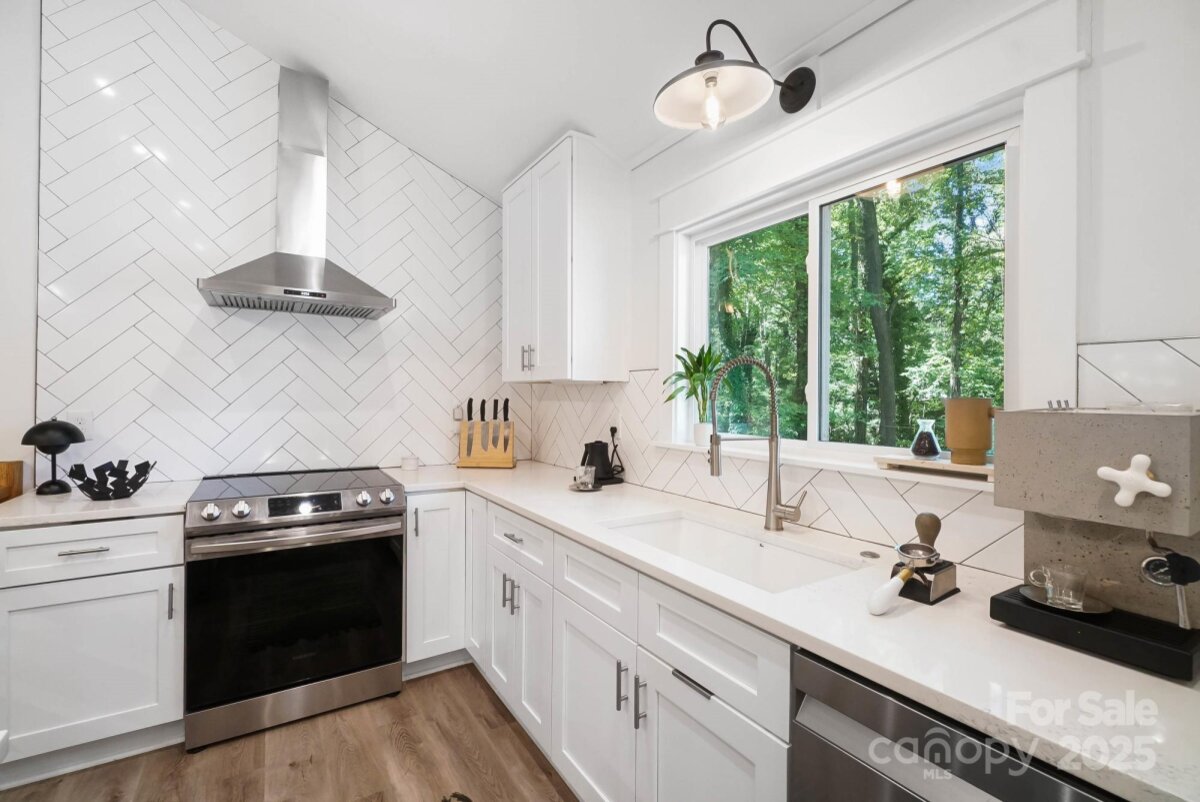 REDUCED $15k! This fully renovated home blends style, comfort, and functionality in every detail. Step inside to an open-concept layout highlighted by vaulted cathedral ceilings, exposed wood beams, designer lighting, and a stunning feature wall that creates architectural interest and warmth. The chef’s kitchen is the centerpiece of the home, showcasing quartz countertops, a large island with built-in microwave, stainless steel Samsung appliances, soft-close cabinetry, and a full herringbone tile backsplash. The dining and living areas flow effortlessly together and are ideal for entertaining or quiet evenings surrounded by natural light. Throughout the home, custom trim, shiplap accents, and sliding barn doors add character, while durable luxury vinyl plank flooring provides beauty and easy maintenance. The primary suite offers a peaceful retreat with a designer barn door, walk-in closet, and spa-inspired bath featuring modern vanity and fixtures, and a beautifully tiled shower surround. Two additional bedrooms or flex spaces complete the thoughtful layout. Additional highlights include a custom mudroom built-in, a spacious den on the lower level with a wood burning fireplace, upgraded lighting and hardware, and fresh paint throughout. Step through the sliding doors onto a spacious deck overlooking a wooded backdrop, perfect for morning coffee or evening gatherings around the fire-pit. You might even spot a few deer. Located close to shops and dining, Reedy Creek Park, UNCC, NODA, Plaza-Midwood and uptown Charlotte. This home offers the perfect blend of convenience, design, and serenity. Every finish has been carefully selected to create a space that feels both fresh and timeless. Welcome home.