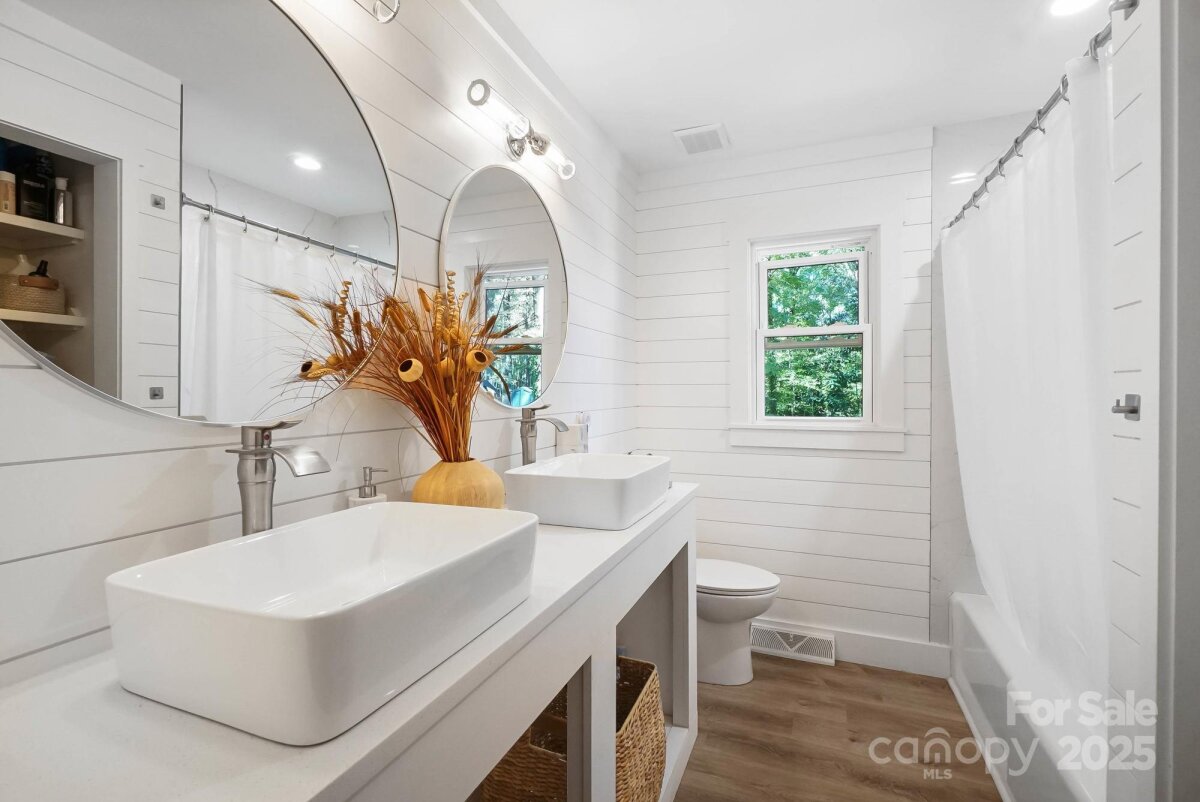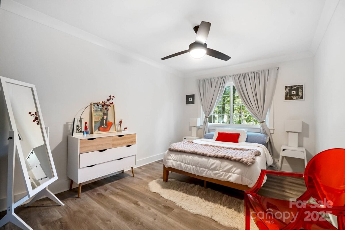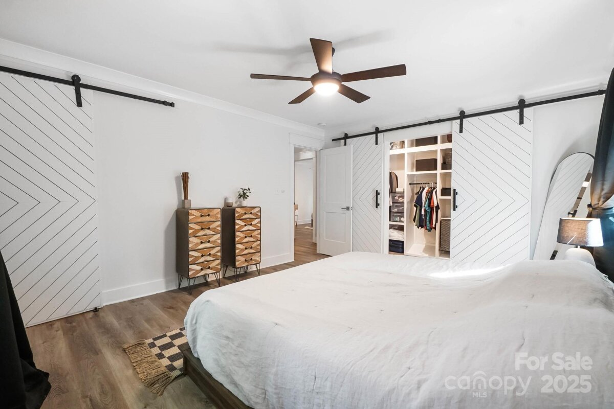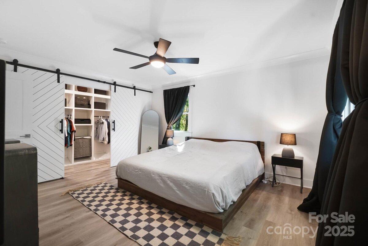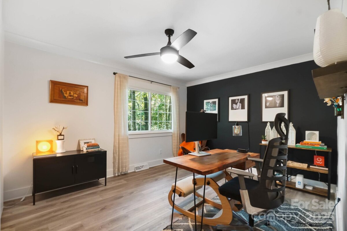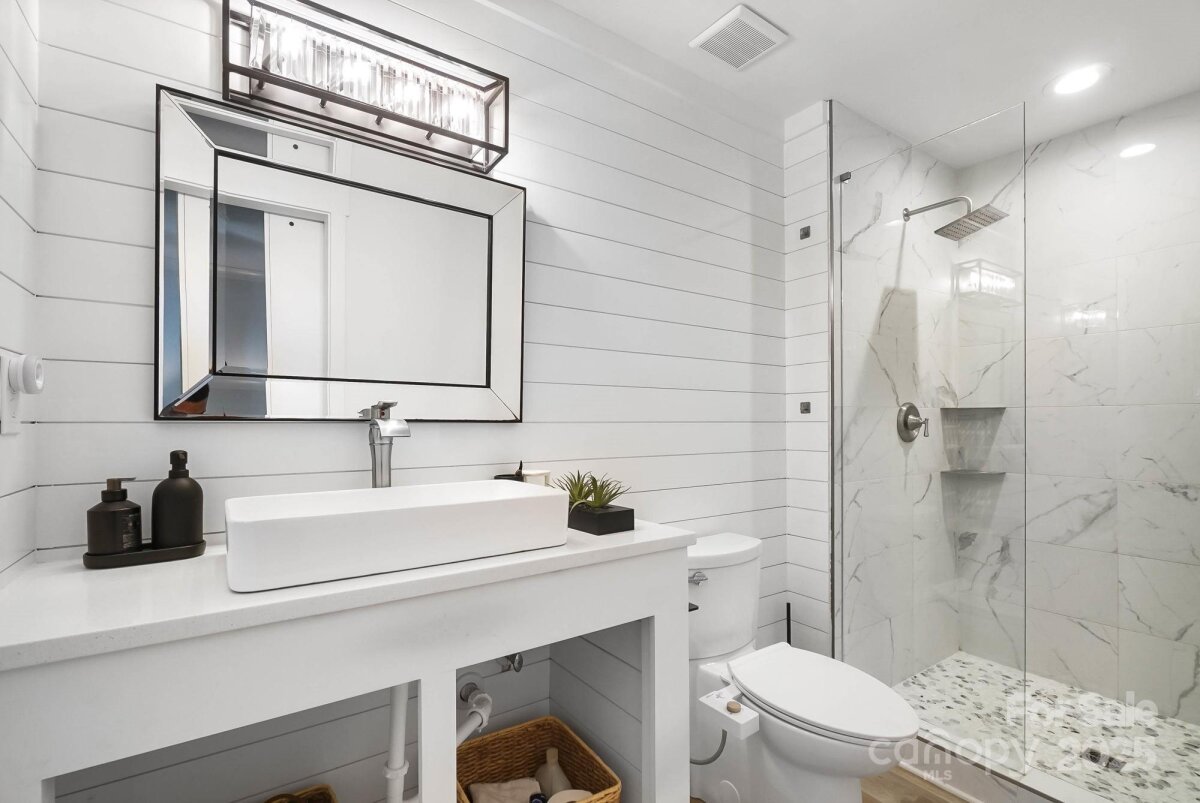 REDUCED $15k! This fully renovated home blends style, comfort, and functionality in every detail. Step inside to an open-concept layout highlighted by vaulted cathedral ceilings, exposed wood beams, designer lighting, and a stunning feature wall that creates architectural interest and warmth. The chef’s kitchen is the centerpiece of the home, showcasing quartz countertops, a large island with built-in microwave, stainless steel Samsung appliances, soft-close cabinetry, and a full herringbone tile backsplash. The dining and living areas flow effortlessly together and are ideal for entertaining or quiet evenings surrounded by natural light. Throughout the home, custom trim, shiplap accents, and sliding barn doors add character, while durable luxury vinyl plank flooring provides beauty and easy maintenance. The primary suite offers a peaceful retreat with a designer barn door, walk-in closet, and spa-inspired bath featuring modern vanity and fixtures, and a beautifully tiled shower surround. Two additional bedrooms or flex spaces complete the thoughtful layout. Additional highlights include a custom mudroom built-in, a spacious den on the lower level with a wood burning fireplace, upgraded lighting and hardware, and fresh paint throughout. Step through the sliding doors onto a spacious deck overlooking a wooded backdrop, perfect for morning coffee or evening gatherings around the fire-pit. You might even spot a few deer. Located close to shops and dining, Reedy Creek Park, UNCC, NODA, Plaza-Midwood and uptown Charlotte. This home offers the perfect blend of convenience, design, and serenity. Every finish has been carefully selected to create a space that feels both fresh and timeless. Welcome home.