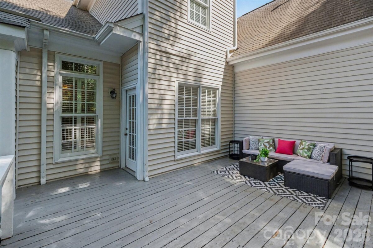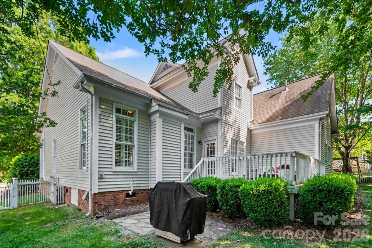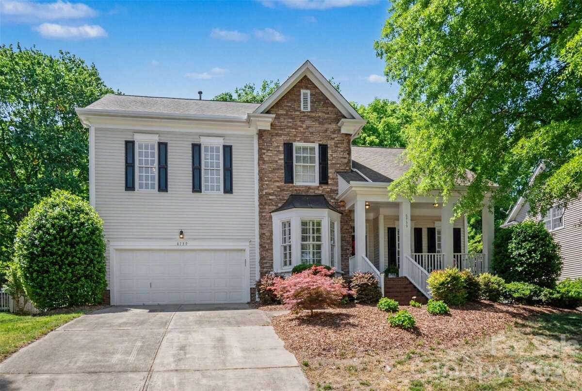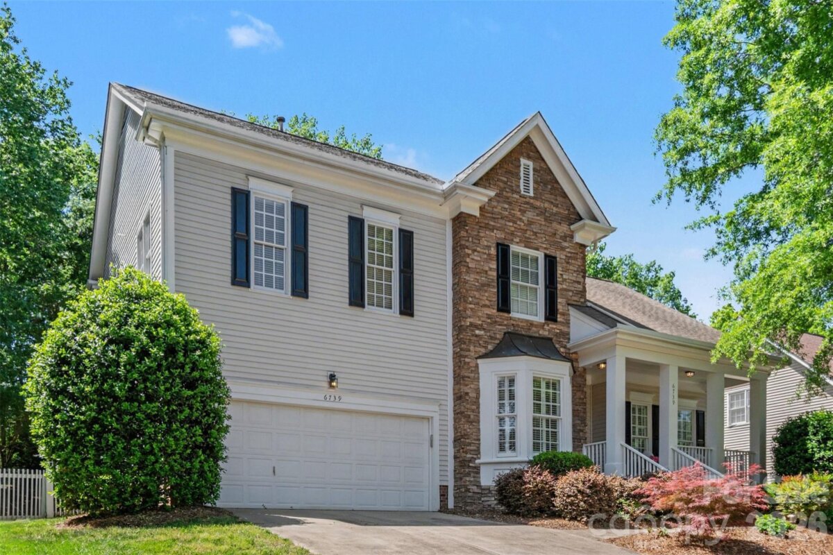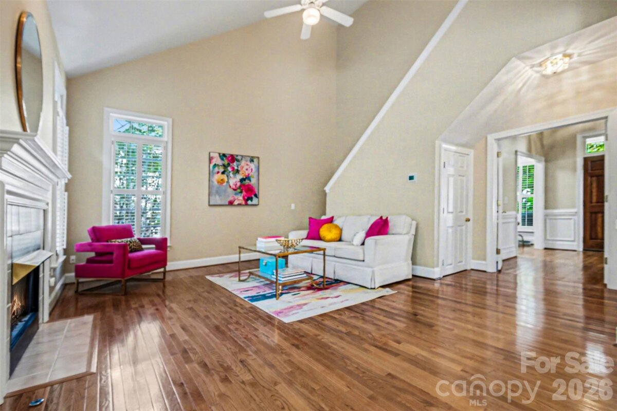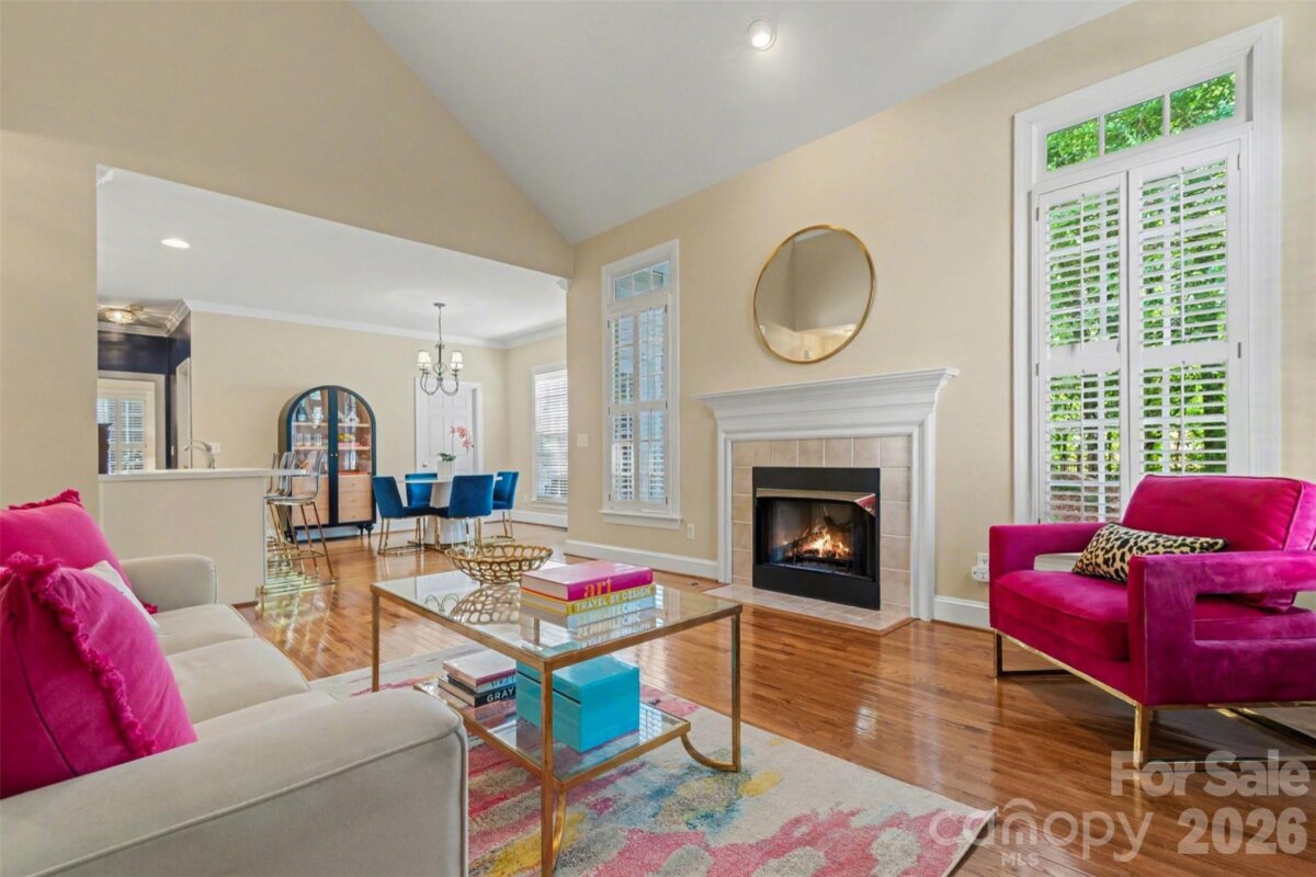 Welcome home! From the moment you arrive, the inviting rocking chair front porch sets the tone—warm, welcoming, and ready to greet you. Step inside this beautifully maintained two-story home where original hardwood floors lead you through a traditional yet flexible layout, including a formal dining room and a living room or home office. Just beyond, the impressive two-story family room with a cozy gas fireplace opens seamlessly to the kitchen, complete with an eat-in dining area—perfect for everyday living and entertaining. The main level also features a spacious primary suite with a private ensuite bath, along with a convenient laundry room, half bath, and direct access to the two-car garage. Step outside to enjoy the fenced backyard and deck, offering a peaceful, wooded backdrop ideal for relaxing or hosting gatherings. Upstairs, you’ll find three generously sized guest bedrooms, a full bath, and an expansive flex room designed for fun and function—complete with a custom bar/beverage center, refrigerator, and pool table. Just off the landing, a large walk-in storage room with built-in shelving and pull-down attic access adds even more practicality. Additional highlights include plantation shutters, updated lighting, and a private setting within the charming, walkable Orchid Hills community—just minutes from shopping, dining, I-485, and entertainment. This is more than a house—it’s a place to truly feel at home. Don’t miss your chance to make it yours! The following items do not convey with the property: Washer & dryer; navy bookcase in office; teal bookcase in upstairs movie room and the outdoor grill do not convey.