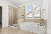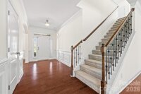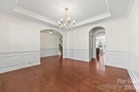 Beautiful, Move in Ready 5 Bedroom 3 Bath home located in The Enclaves at Crismark! This Craftsman-style residence welcomes you wit charming curb appeal and a spacious front porch. Inside, the home features a hardwood floored foyer, formal dining room, butler's bar, pantry, leading into an open-concept living room/kitchen perfect for everyday living and entertainment. The Kitchen is well appointed with dark wood cabinetry, granite countertops, stainless steel appliances, gas range, wall mounted oven, and a center island. The adjoining breakfast area, accented by plantation shutters, overlooks the fenced backyard with a peaceful wooded backdrop. Outdoor living is enhanced by a paver patio and trellis, creating an ideal space to relax and entertain. A main-level bedroom and full bath provide flexibility for guests or those seeking a stair free living option. Upstairs, the primary suite features including a tray celing and a en-suite bathroom with dual vaniites, private water closet, Shower, soaking tub, and large walk in closet. The neighborhood provides several amenties including pool and club house. Conviently located near the I-485 beltloop, travel around Charlotte is easy. We welcome you to come take a look at this beautiful home!