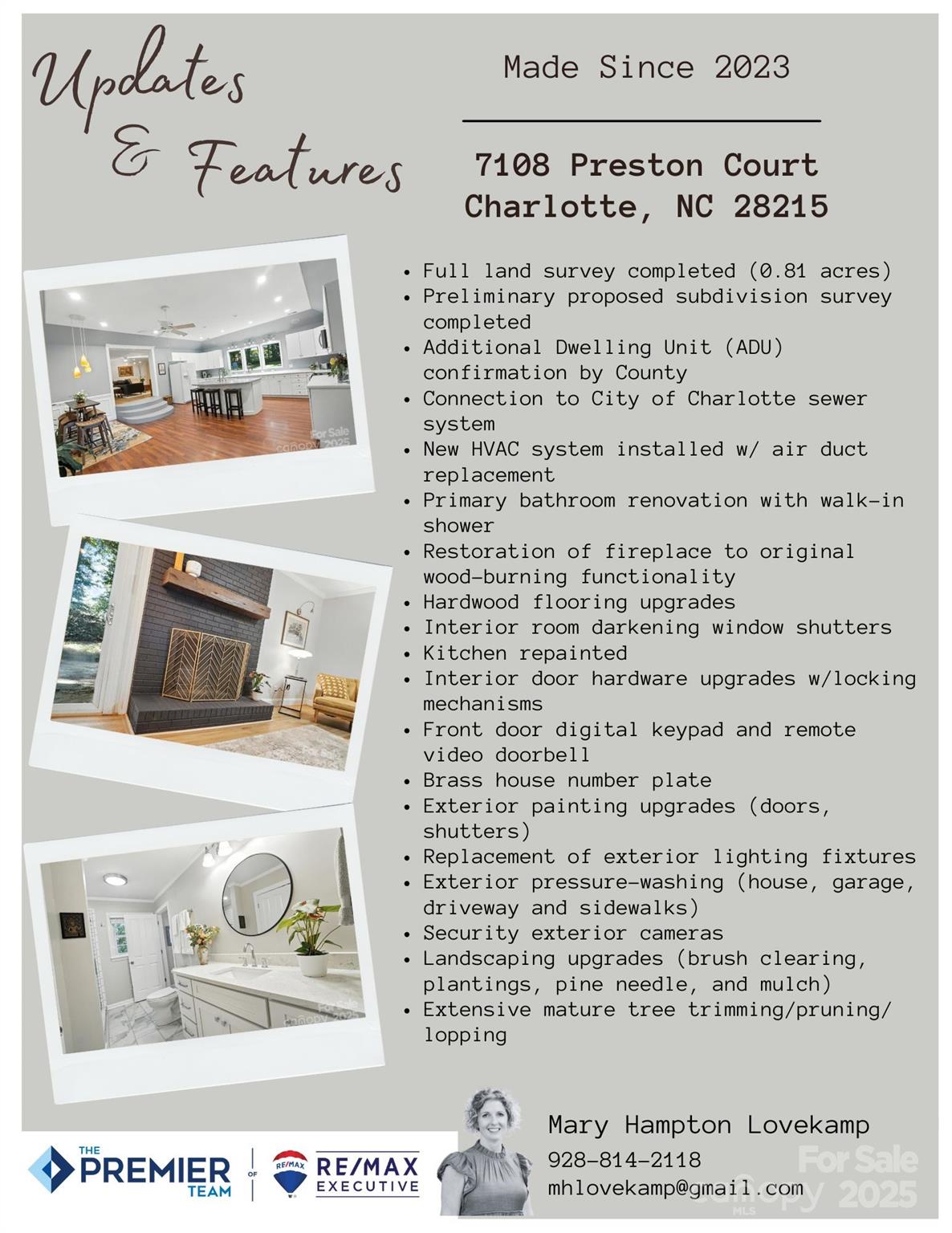MOTIVATED SELLER!! MIDCENTURY MODERN residence with opportunities for INVESTORS or MULTI-GENERATIONAL or MULTI-FAMILY LIVING! Located in the coveted Grove Park neighborhood in east Charlotte, this immaculate home sits at the end of a quiet, wooded cul-de-sac with quick access to major thoroughfares. Steps off Williams Lake, the .81 acre property includes a CLEARED, LEVEL SIDE YARD with road access which provides hard-to-find potential to be SUBDIVIDED and used to build a 2ND HOME.This home offers a large open living space, white oak floors throughout and a wood burning fireplace. The oversized, eat-in kitchen, featuring a double oven and dual sinks, is perfect for entertaining. One bathroom has been recently renovated with a walk-in shower, while the other retains its classic charm. The detached garage includes 240V/50amp electricity and potential for adding on to it to create a preapproved Accessory Dwelling Unit (ADU). Also, new ring doorbell and security cameras to convey. Whether you’re seeking a move-in ready home with character or a savvy investment opportunity, this property delivers style and future potential all in one perfect package.