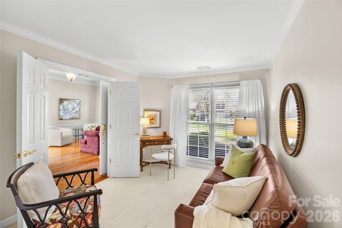 Located in the gated community of Pullengreen in the heart of Ballantyne, this light-filled home offers exceptional one-level living with access to walking trails and nearby shops and restaurants. Designed for both comfort and entertaining, the open floorplan features a spacious kitchen with white cabinetry, granite countertops, and stainless steel JennAir appliances. Kitchen flows seamlessly into the family room with wood burning fireplace. Elegant moldings, along with formal living and dining rooms, add timeless character throughout. The inviting Archadeck built screened porch features multi track adjustable panels that transform the space into a sunroom, creating a seamless indoor-outdoor living experience year-round. The large primary suite offers a peaceful retreat with direct access to a private patio garden—perfect for additional outdoor seating. The renovated en-suite primary bath features heated tile floors, dual vanities, with granite countertops, a soaking tub, and an oversized tiled shower with frameless glass. Additional highlights include a dedicated office space off the primary suite, a beautifully renovated hall bath with granite countertops and an oversized shower, and a flexible third bedroom currently used as a den. A laundry room and two-car garage complete the home. HOA maintains front yard landscaping. Also, new roof, new gutters and gutter guards, and copper top replaced on front windows in 2025.