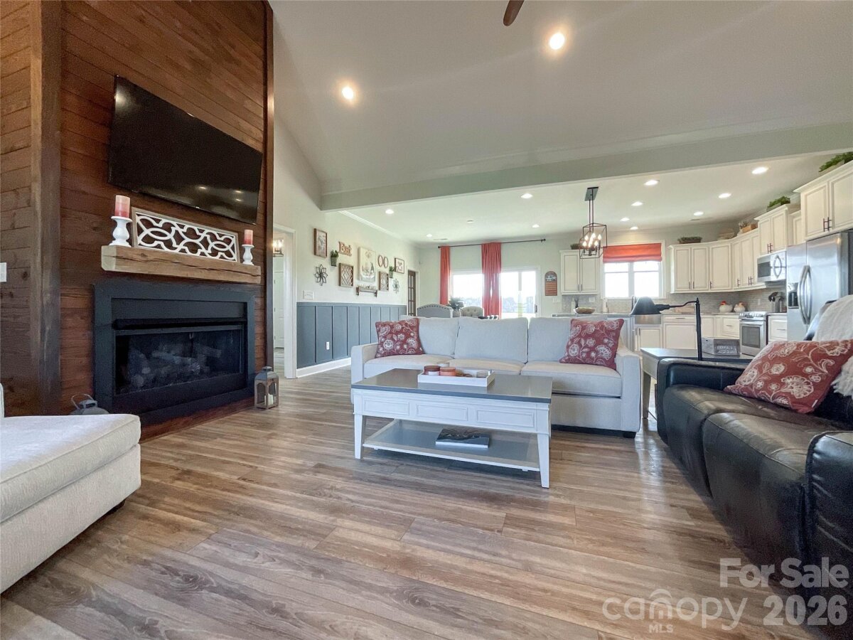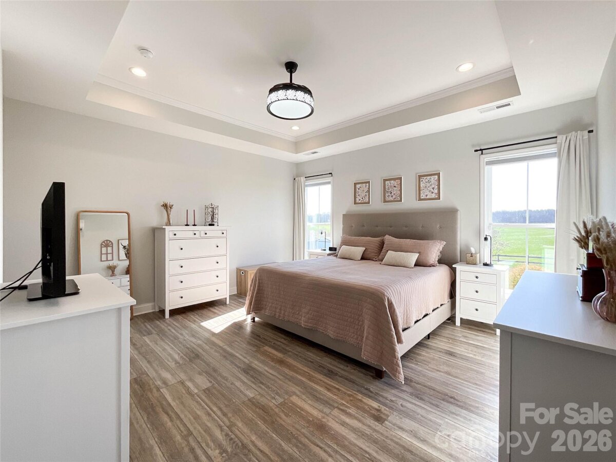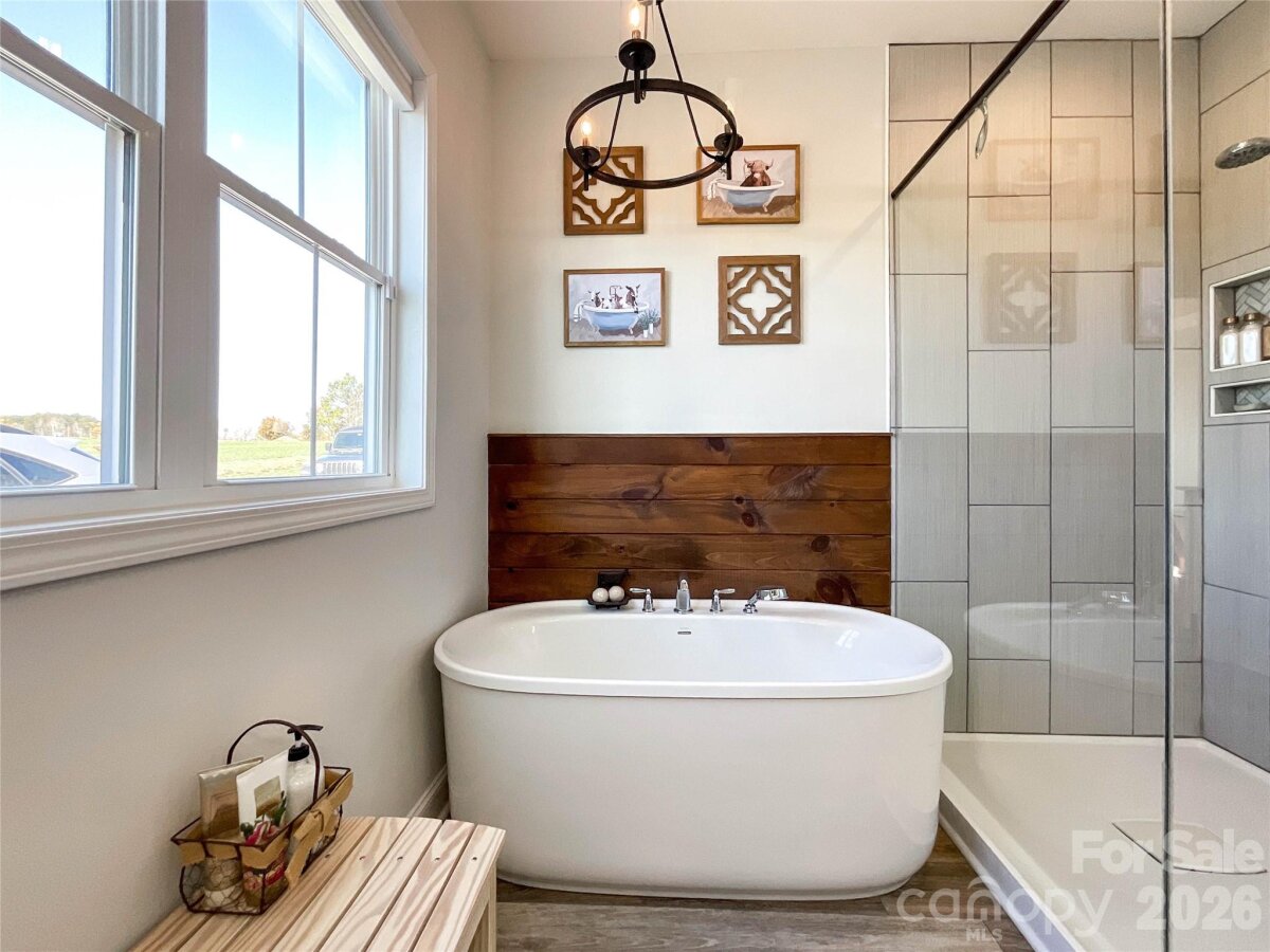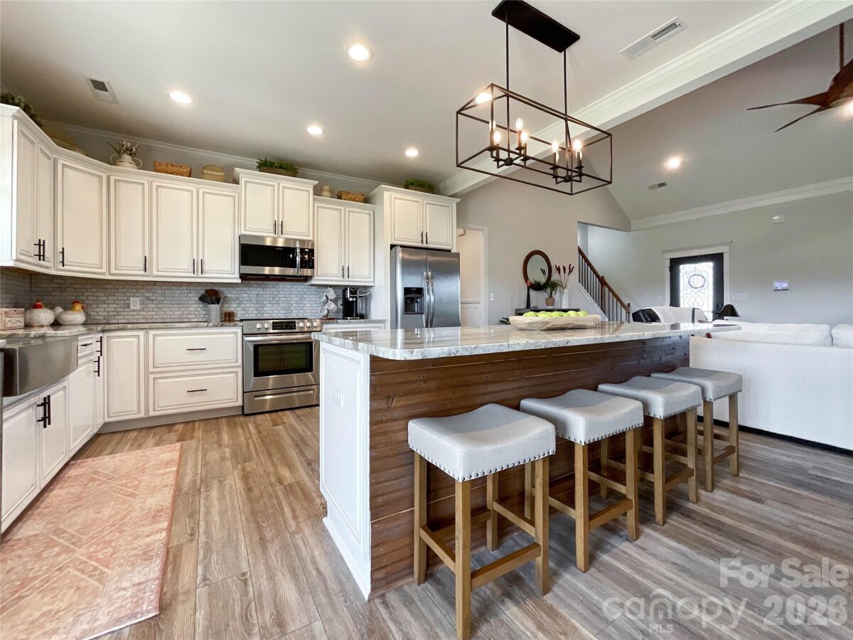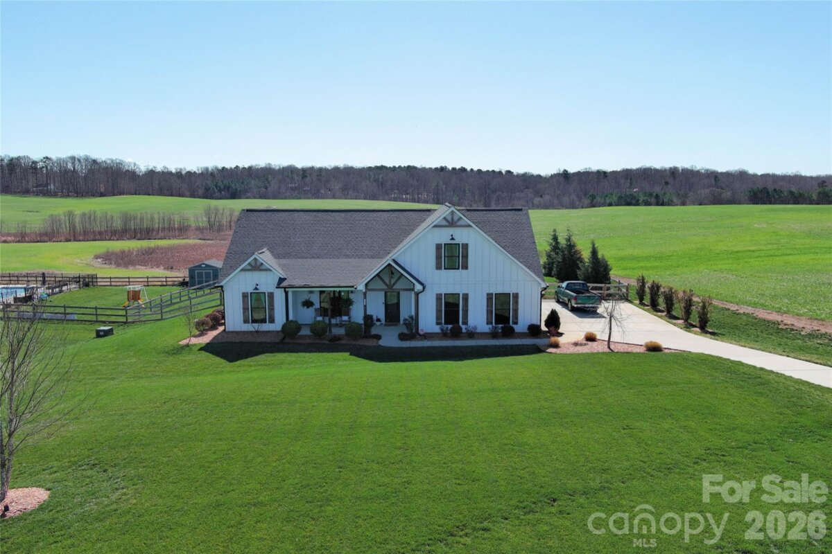 The perfect blend of privacy and convenience just minutes from downtown Waxhaw! This modern farmhouse sits on a beautifully manicured one-acre lot, with flowering cherry trees lining the driveway for the perfect first impression. Enjoy relaxing on the spacious covered front porch or entertaining on the large covered back patio overlooking the stunning fenced backyard.Inside, the open floor plan features a vaulted ceiling and floor-to-ceiling shiplap framing the cozy gas log fireplace. Large Chefs kitchen is designed for gathering, complete with a large island, abundant cabinetry, granite countertops, stainless steel appliances, and a walk-in pantry. The main-level laundry room with side entry adds everyday convenience to this thoughtfully designed home.The split-bedroom layout offers privacy, with a primary suite showcasing tray ceilings and a spa-like bath featuring double vanities, a standalone soaking tub, and a separate shower. Two additional bedrooms on the main level share a full bath with double vanities. Upstairs, you’ll find a spacious fourth bedroom with a full bath, plus a bonus room perfect for a home office or flex space. Every detail has been thoughtfully designed for comfort & elegance. Don't miss this remarkable opportunity.