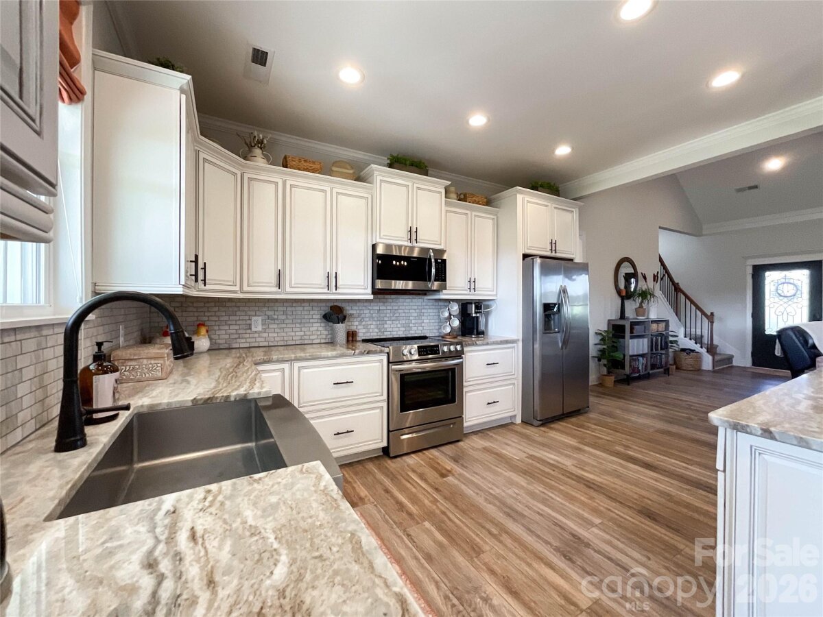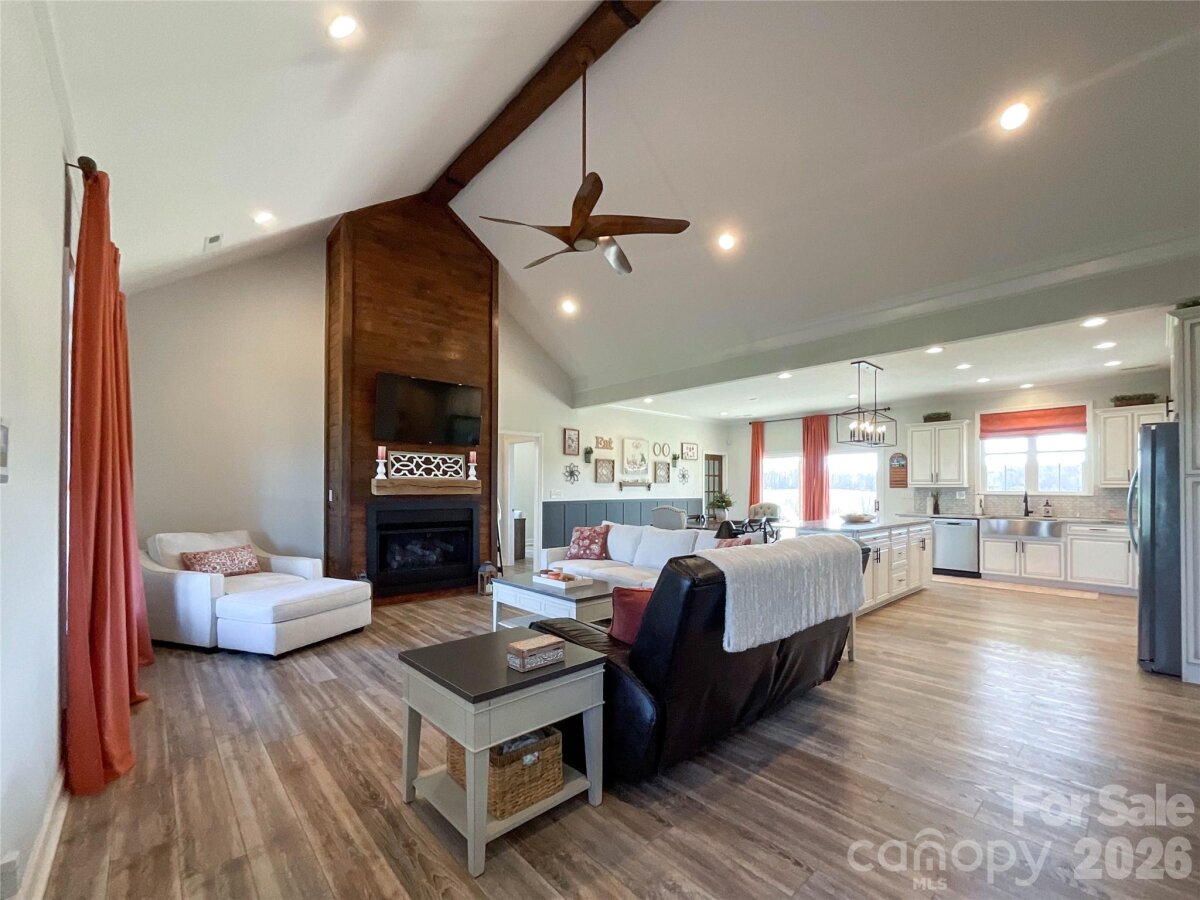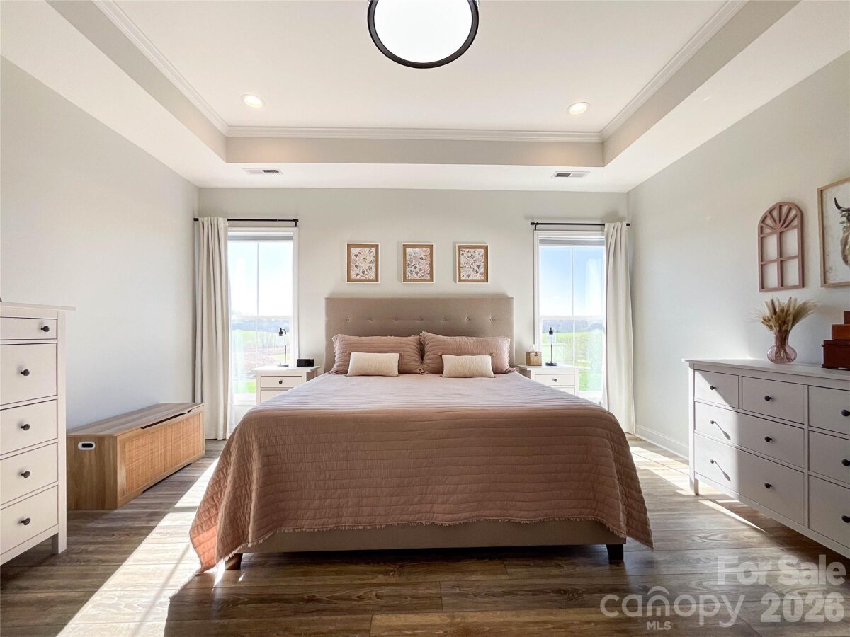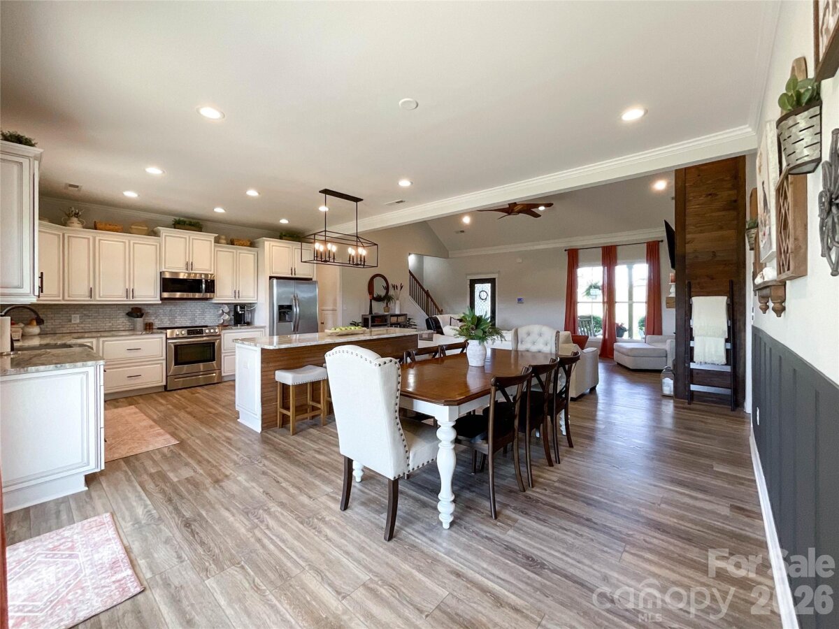 The perfect blend of privacy and convenience just minutes from downtown Waxhaw! This modern farmhouse sits on a beautifully manicured one-acre lot, with flowering cherry trees lining the driveway for the perfect first impression. Enjoy relaxing on the spacious covered front porch or entertaining on the large covered back patio overlooking the stunning fenced backyard.Inside, the open floor plan features a vaulted ceiling and floor-to-ceiling shiplap framing the cozy gas log fireplace. Large Chefs kitchen is designed for gathering, complete with a large island, abundant cabinetry, granite countertops, stainless steel appliances, and a walk-in pantry. The main-level laundry room with side entry adds everyday convenience to this thoughtfully designed home.The split-bedroom layout offers privacy, with a primary suite showcasing tray ceilings and a spa-like bath featuring double vanities, a standalone soaking tub, and a separate shower. Two additional bedrooms on the main level share a full bath with double vanities. Upstairs, you’ll find a spacious fourth bedroom with a full bath, plus a bonus room perfect for a home office or flex space. Every detail has been thoughtfully designed for comfort & elegance. Don't miss this remarkable opportunity.