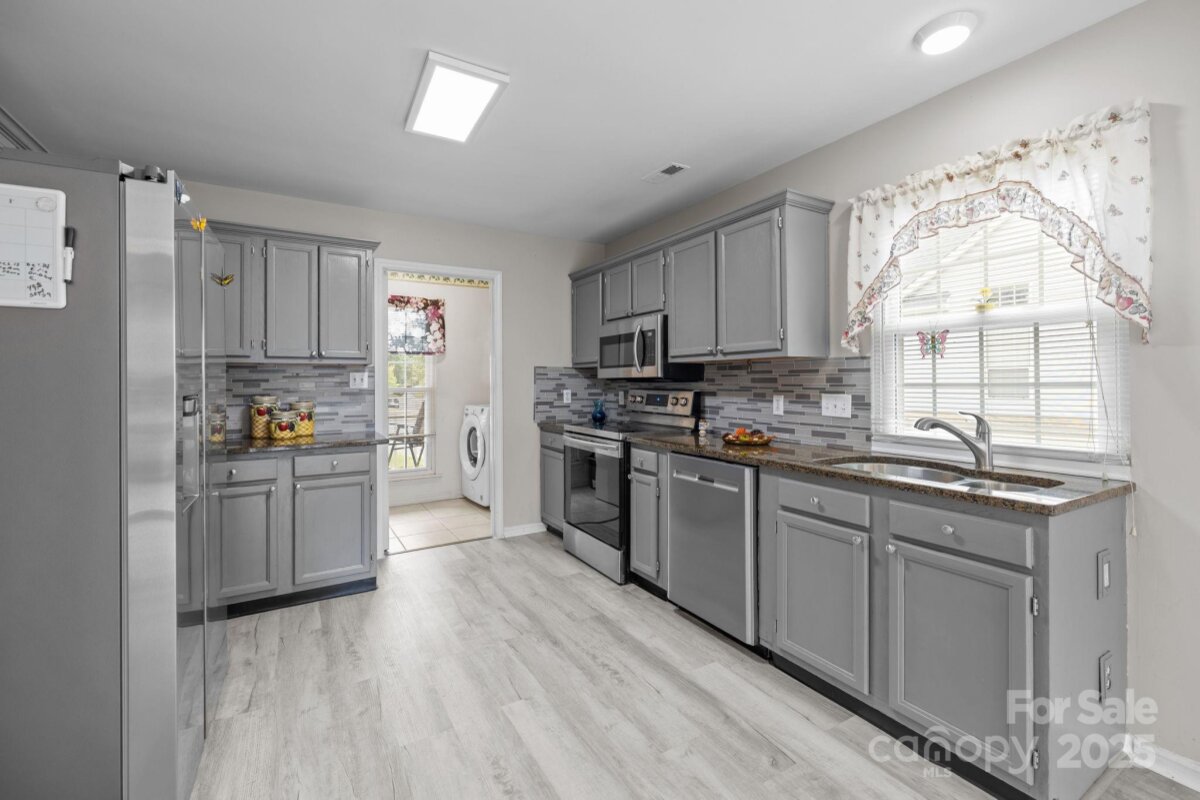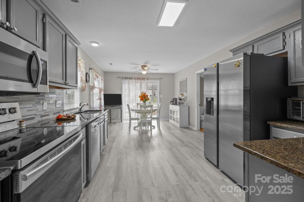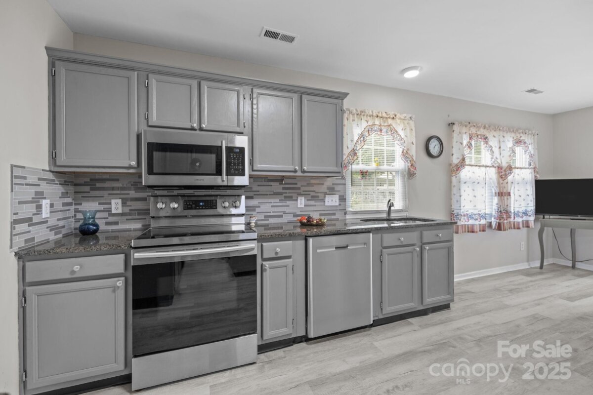 Excellent Opportunity for First-Time Home Buyers, Downsizers, or Investors! Good Quality 3 Bed 2.5 Bath Home built in 1989 (same owner since 1993), situated on .23 Acres in Morris Village (Great Location!) w/No HOA! Mature Trees, Relaxing Rocking Chair Front Porch and Spacious Fenced Backyard w/Tool Shed. Brand-New Gas Furnace/AC installed Sept. 2025 ensuring peace of mind for years to come offers warm heat and energy savings w/no old unit repair concerns. Wow! What-a-Kitchen! Spacious, nicely updated(2019) Eat-In Kitchen is a great place to start your day w/natural light flooding through several windows and heavy Sliding Glass Doors (New Vertical Blinds just installed Oct.'25). Kitchen updates include LVP Flooring, Granite Countertops, and Quality Stainless Steel Appliances including a SS Samsung Fridge (2024). Whirlpool Front Load Washer(2025) and older Dryer included in the connecting Laundry Room w/Ceramic Tile, ample Shelving, and a self-standing Cabinet for storage. The Vaulted Ceiling in the Primary Suite adds breathable space and a modern touch. Well-made Handmade Curtains throughout. Feel the warmth and smell the wood burning in the Fireplace w/a traditional Raised Brick Hearth. Prefinished Hardwood Flooring and included TV above the mantel completes this Cozy Living Room. Small Entry Way includes a Coat Closet! It's the little things that provide that needed functionality. Smart Floor Plan...functional closets, spacious full bathrooms, laundry room w/storage, stairwell to the back adds perfect feng shui, plus an outside entry, insulated utility room w/gas water heater. Architectural Shingles(2010). Windows replaced several years ago, (?) install date. Exterior Vinyl Siding placed over Masonite Siding several years ago, (?) install date. Personal items to convey...Refrigerator, Washer, Dryer, Outside Shed, Outside Hanging Lights, Black Closet Cabinet in Laundry Room, TV over Fireplace, and Satellite Dish. Mint Hill Vibe with a Charlotte address! Enjoy affordable living with low taxes and shopping just around the corner, plus it's approx. 10 miles to Uptown Charlotte! Schedule a showing today and see if this feels like home to you. Bring your offer and change your life!