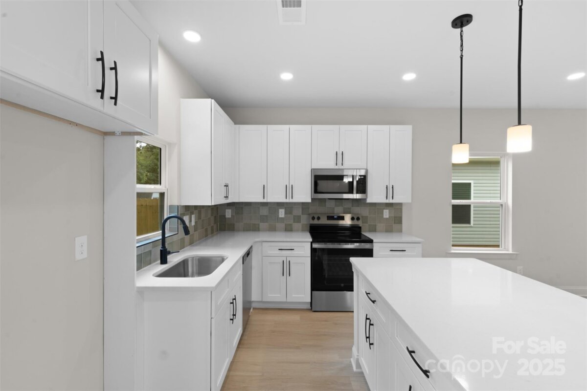 MOVE IN READY PACKAGE included - 6’ privacy fence, washer, dryer & blinds! 3 upgraded single family homes! Builder/Lender offering 2-1 Rate Buy Down (rates in the 4's). Also qualifies for 100% financing and $20,000 in closing costs! Stunning new construction 3 bedroom single family ranch home located located minutes North of Uptown Charlotte Open floor plan featuring 9 foot ceilings throughout and luxurious finishes such as quartz countertops, white shaker cabinetry with 42" uppers, soft close doors & dovetail drawers, designer tiled backsplash and designer tile in both primary and guest baths. Turnkey move in ready home perfect for first time buyers and investors. Loaded with upgrades including luxury vinyl plank flooring throughout, Pella windows & doors, stainless steel appliance package, black hardware and Moen plumbing fixtures. Primary suite offers ensuite bath with dual vanity and spacious walk in closet. Complete with a covered front porch, rear patio & flat fenced in back yards! No HOA!