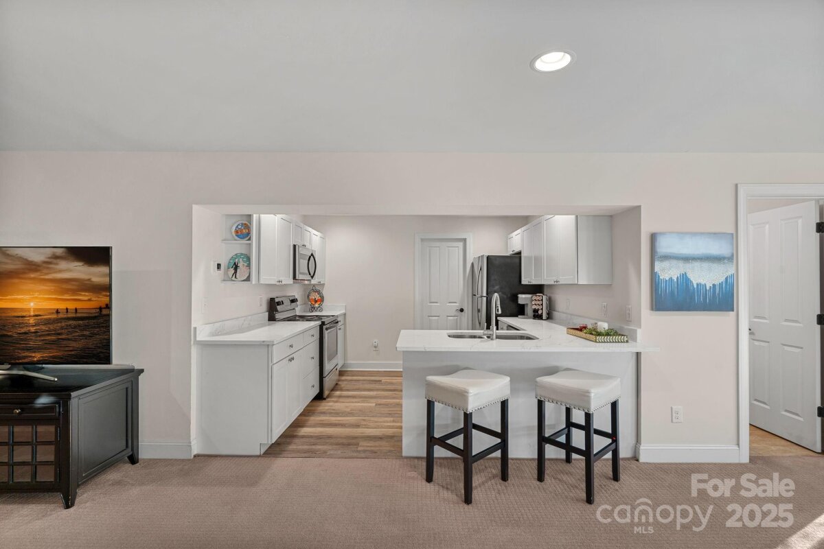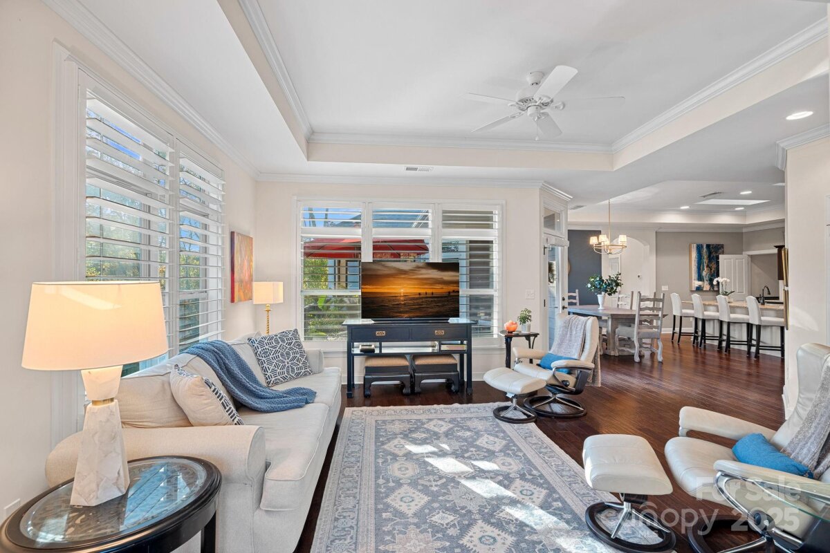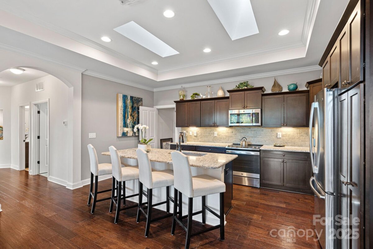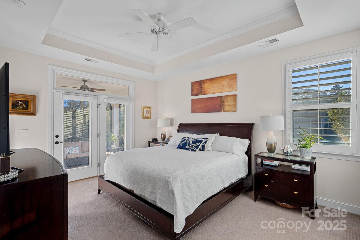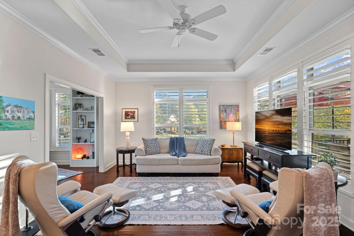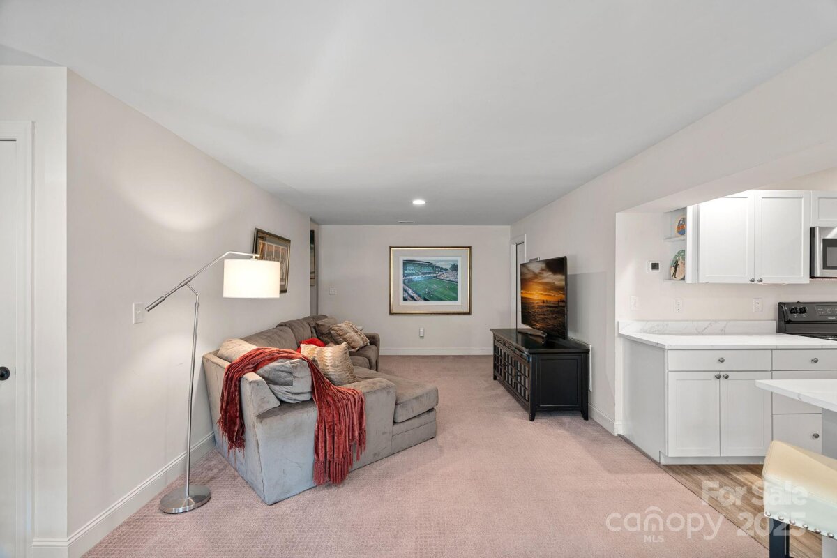 Mother-in-law suite, guest suite, man cave, game space, hobby/craft space - possibilities are endless. With a private, fully-equipped and functional lower level second living quarters AND magnificent SUNSET views, this exceptional home offers a combination of functionality, comfort and beauty. Perfectly situated on one of the most desirable lots in this 55+ community of The Courtyards of Huntersville, the property enjoys unmatched privacy with no home directly across the street or to the side and is quietly tucked away at the back of the intimate neighborhood. A major highlight is the thoughtfully designed LOWER LEVEL SUITE. This private space has its own exterior entrance and includes two living areas, a dining area, a full kitchen with new quartz countertops and sink, full-size appliances and an oversized pantry. The suite also features a spacious bedroom with a walk-in closet and pond views, a full bath with a new vanity, stackable, full-size washer and dryer, and a private patio overlooking a tranquil reflection pond and water feature. The main level is filled with natural light thanks to the absence of an adjacent home, as well as skylights in the kitchen and primary bath. The layout includes a welcoming foyer, a sunroom/home office, living and dining rooms, a spacious kitchen, laundry room, and a full guest bath, along with a primary suite and an additional guest bedroom. An upgraded kitchen boasts quartz countertops, a subway tile backsplash, a new range and dishwasher, and a pantry cabinet with pull-out shelving. The optional sunroom/office features a custom built-in desk with a quartz countertop, lockable drawers, storage, slide-out printer trays, and a built-in bookshelf—perfect for working from home. An enhanced laundry room includes upper and lower custom cabinetry with glass doors, a deep sink, subway tile backsplash, and a built-in beverage refrigerator creating a fully functional mini beverage bar. Both main-level baths have been updated with new quartz countertops, deep sinks, and faucets. The primary bedroom is a true retreat, complete with a spacious Closets By Design custom closet system and direct access to a screened and covered deck area. A new screened porch off the primary bedroom features two custom retractable screens, and elegant plantation shutters with dual control have been installed throughout the home. A maintenance free, elevated deck with multiple seating and dining spaces, spans the side of the home and overlooks a natural area where breathtaking sunsets will be enjoyed. The two-car garage offers epoxy-coated, non-skid flooring and a convenient wall-mounted vacuum unit. Pull down garage stairs leads to an incredible amount of storage above the garage. Five ceiling fans have been added in living spaces and bedrooms. The home's exterior was freshly painted in 2025 and features an attractive combination of fiber cement and stone. The community offers a wide range of amenities, including a clubhouse for social events with a full kitchen, fitness facility, and swimming pool. Sidewalks and streetlights, natural areas, extensive landscaping and pond add to the neighborhood’s charm. The HOA maintains all landscaping (except private courtyards) and the exteriors of the homes so homeowners only need an HO6 insurance policy. Two kitchen refrigerators, beverage refrigerator and two washer and dryers are included. Easy access to Beatties Ford Road, Gilead Road, Hwy 73 and I77, Birkdale, Blythe Landing, Jetton Park, Marinas, Shopping and Dining. In close proximity to hospitals/medical centers. Pre-inspected and adjustments made! The Courtyards of Huntersville homes are classified as condos by the Town of Huntersville but live like single family homes.