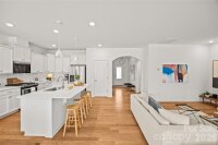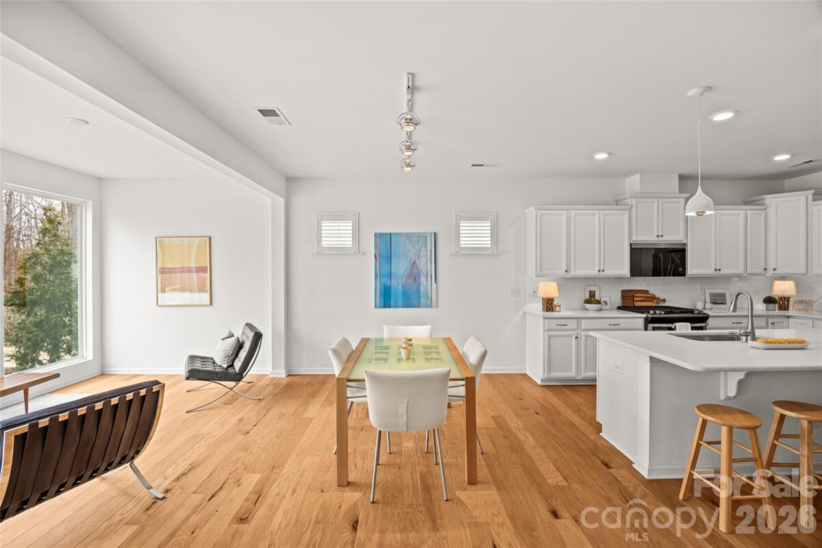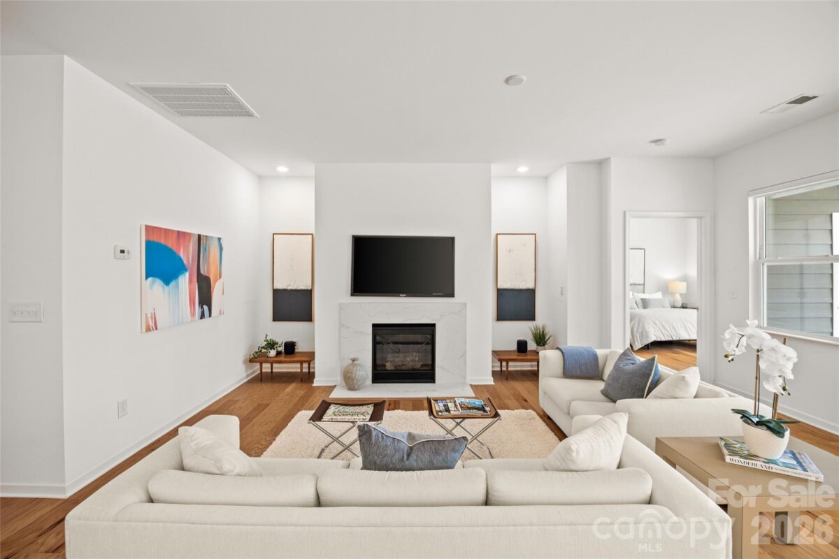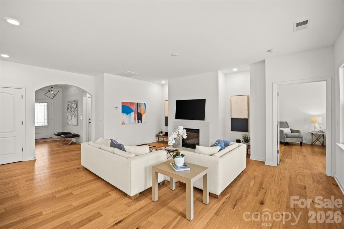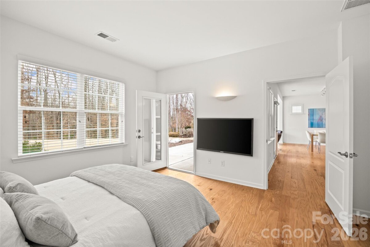 Welcome to this beautifully maintained, modern ranch home in Tree Tops, an exclusive gated 55+ community surrounded by lush landscape, serene woods, and mature trees. This gorgeous home offers effortless single-story living on a peaceful, private lot with stunning views of the woods from its spectacular sunroom, designed with floor-to-ceiling windows that fill the space with natural light. The open-concept floor plan features wood flooring throughout and a bright, white gourmet kitchen complete with ample countertops, gas range, and a spacious dining area ideal for everyday living and easy entertaining. This primary suite is generously sized with a double vanity, walk-in shower and a spacious walk-in closest. The second bedroom can also be used as an office. The kitchen has plenty of cabinets and counter space and the kitchen island makes meal prep a breeze. The home has a tankless water heater, and full irrigation system for low-maintenance living. Enjoy quiet mornings in your modern sunroom or on your covered porch overlooking the woods, or explore the countless amenities Tree Tops has to offer. Residents enjoy access to a state-of-the-art fitness center, resort-style pool, tennis and pickleball courts, bocce ball, walking trails, a fishing pier, and canoes for outdoor enthusiasts. The clubhouse, amphitheater, and community cabins—perfect for card games, crafts, and social gatherings—create a vibrant, welcoming atmosphere. Tree Tops is a community where neighbors become friends and the lifestyle is truly unmatched. Don’t miss this rare opportunity to own a modern home with gorgeous wooded views in one of Indian Land’s most desirable active adult neighborhoods! Easy living as lawn maintenance and garbage service is included in the HOA dues.