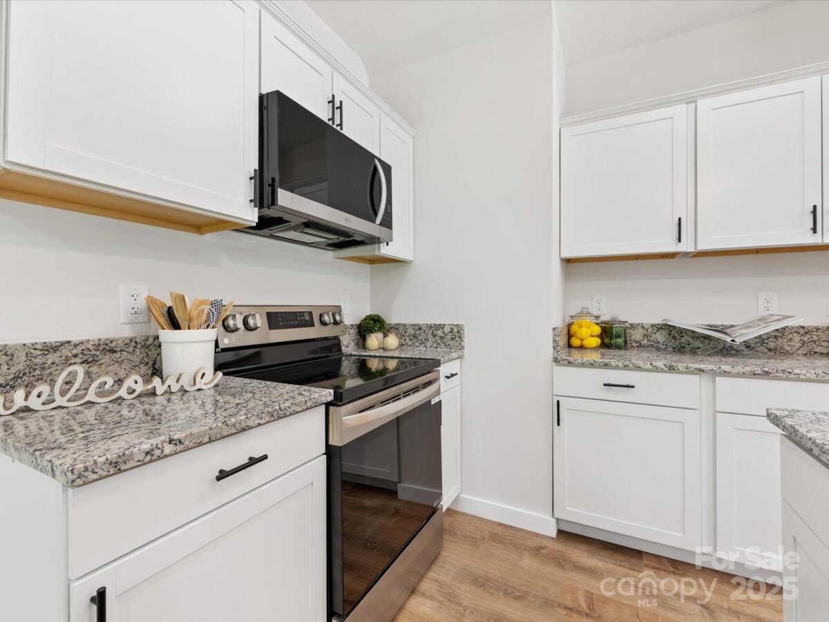 Introducing an incredible opportunity for ranch-style living that combines convenience and modern elegance — without any HOA fees and little yard maintenance! This stunning brand-new construction has luxury vinyl flooring throughout and boasts 3 bedrooms and 2.5 baths, with primary suite conveniently located on the main level, while two additional roomy bedrooms are situated upstairs. Step inside to be welcomed by gorgeous luxury vinyl plank flooring and an inviting open layout that features a family room adorned with an eye-catching board and batten wall. The kitchen is complete with a stylish island that offers extra seating and stunning granite countertops paired with sleek white cabinetry. It flows seamlessly into a cozy breakfast nook. Plus, there's an outdoor storage area ideal for stashing bikes and all your outdoor gear. This home is designed for entertaining, providing effortless access to the patio and porch for those indoor/outdoor gatherings that everyone loves. The builder has meticulously installed exquisite trim work, making every detail shine. Situated in a fantastic location just minutes from downtown Statesville and I-77, you can reach North Charlotte in about 30 minutes or the Panthers Stadium and other Uptown Charlotte attractions in around 40 minutes. And don’t forget, you're just a short walk away from the neighborhood park! This gem is an absolute must-see — don’t miss out!