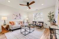 This charming bungalow in historic Belmont neighborhood offers an unbeatable location - walk to the light rail, local restaurants, and just minutes from Uptown Charlotte and vibrant neighborhoods like Plaza Midwood and NoDa. Inside, the open floor plan features 4 bedrooms and a beautifully updated white kitchen with butcher block countertops, stainless steel appliances, a large farmhouse sink, island seating, and gorgeous tiled floors. The kitchen flows seamlessly into the family room, creating the perfect space for everyday living and entertaining. Fresh paint throughout the home adds a bright, move-in-ready feel. A spacious rear laundry room offers flexibility for a home office or cozy sitting area. The private backyard with partial fencing is ideal for relaxing or entertaining, and the recently added shed provides extra storage. Durable vinyl plank flooring runs throughout the home. Major updates include a newer roof (2020), HVAC (2024), and a revamped crawl space with an industrial-grade dehumidifier for added peace of mind. No HOA, offering flexibility for short-term rentals. The front porch and family room window in the front offer amazing night time skyline views of Uptown Charlotte! Enjoy easy access to the Little Sugar Creek Greenway, and stroll to favorites like Rosie's Coffee and Wine Garden, Birdsong Brewing Co, the beautiful McGill Rose Garden, and hotspots such as Optimist Hall, neighborhood restaurants and coffee shops. Move-in ready and perfectly located, this home is ready to welcome its next owners!