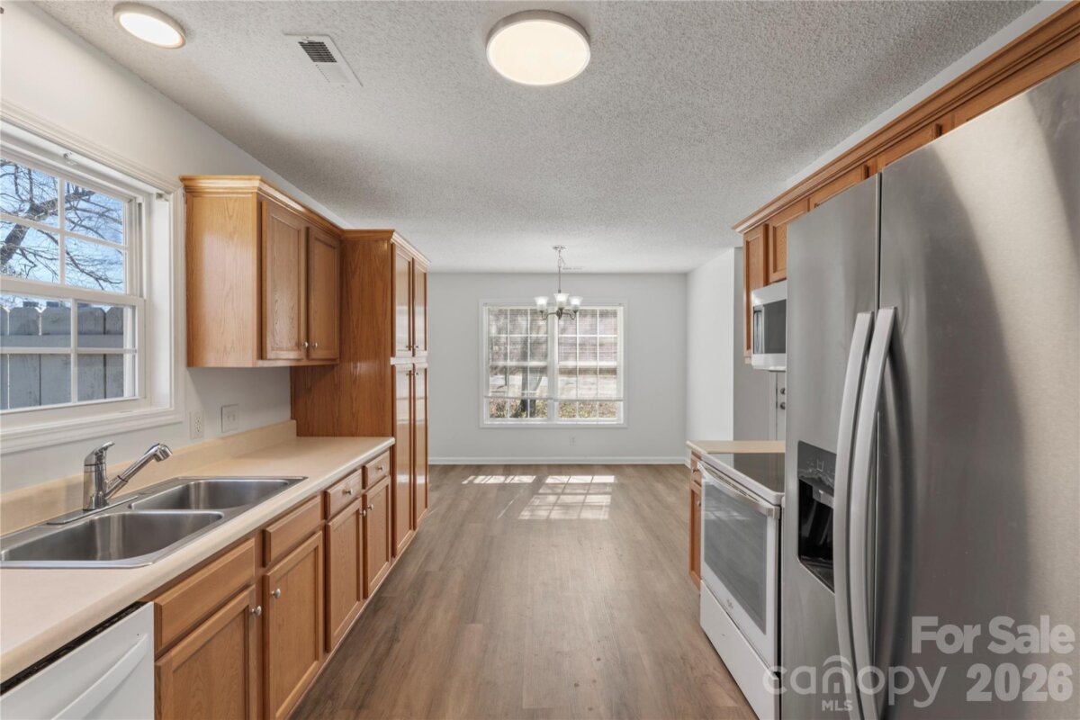 Charming Ranch home offering 3 bedrooms and 2 bathrooms with a bright, open floor plan designed for comfortable living. Fresh paint and new Vinyl plank flooring flows throughout the home complementing the light-filled living room with large windows and generous space for relaxing or entertaining. The galley-style kitchen features abundant cabinetry, updated appliances, ample counter space, seamlessly connecting to a bright dining area perfect for gatherings or a quick meal. The primary suite offers a private retreat with an ensuite bath and a spacious walk-in closet. Two additional bedrooms provide flexibility for guests, work, or hobbies allowing the home to fit various lifestyles. Enjoy outdoor living in the large, fenced backyard with plenty of room for play, pets, or gardening. Newer roof and water heater plus siding recently replaced as well! Additional storage is available in the attic, accessible through the hall ceiling hatch. Easy access to I77 and close to everything that Rock Hill has to offer!