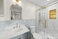 Fully permitted, high-quality renovation on an amazing lot in a central Rock Hill location just minutes from downtown. This 3-bedroom, 2-full-bath home offers space, privacy, and modern upgrades — all under $250,000 with no HOA. The kitchen is a standout, featuring custom ¾†plywood cabinetry, marble countertops, new stainless steel appliances, and gold-accented hardware and fixtures. Red oak hardwood floors run throughout the home, complemented by recessed lighting in the living room and fresh interior paint. The fully custom primary bathroom showcases a modern design with a gold sliding glass shower door, gold shower niche, and permitted plumbing upgrades. Additional permitted improvements include a full electrical rewire with upgraded 200-amp service, reworked laundry area and all brand new gutters from Charlotte Gutters Express. Major systems have been professionally addressed, with the HVAC serviced by Southern Heating & Air and the roof fully inspected and serviced. Outdoor living shines with a covered back porch finished with brick pavers, a rear storage shed, carport, fresh exterior paint, and fully landscaped yard — ideal for enjoying the lot and outdoor space. Move-in ready, thoughtfully renovated, and hard to find at this price point with these features and location.
