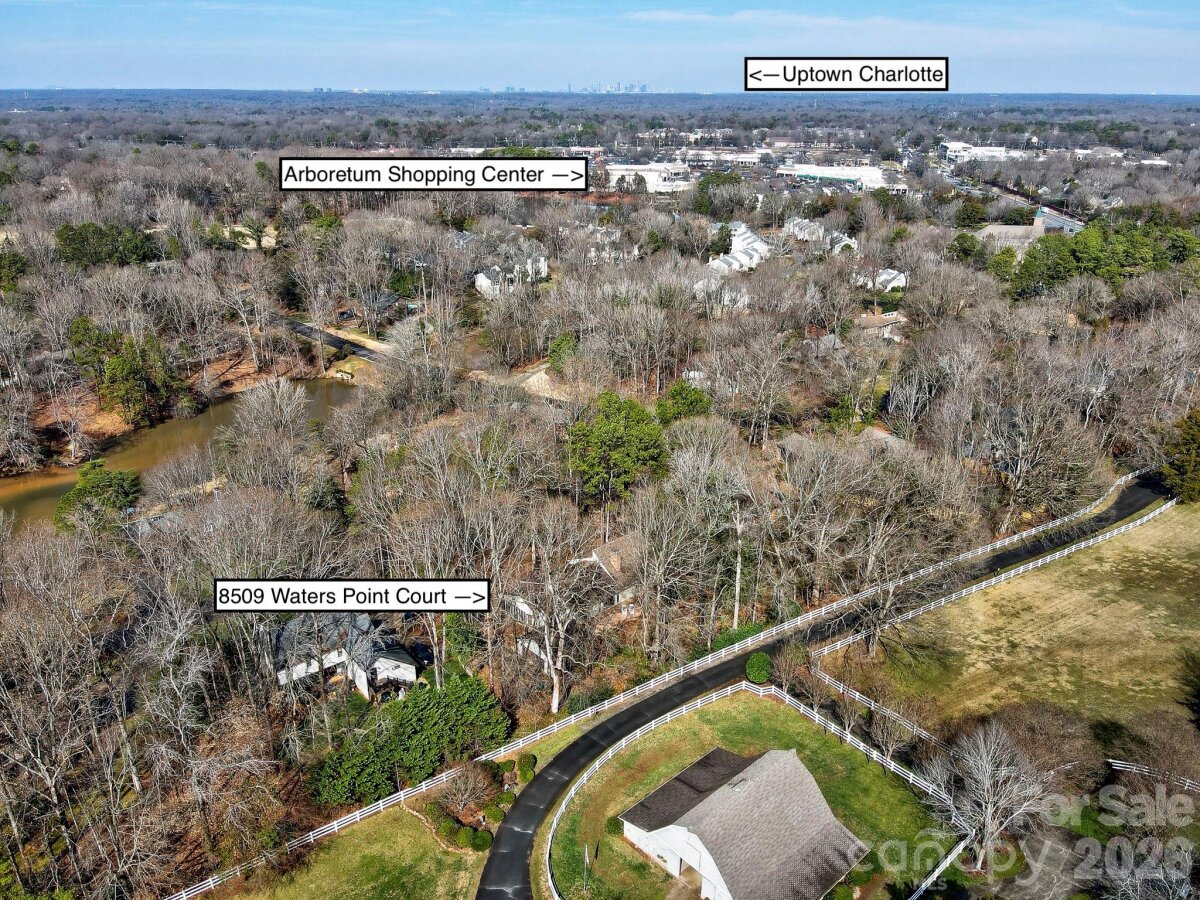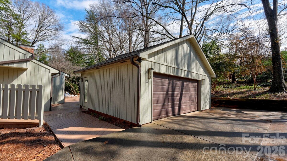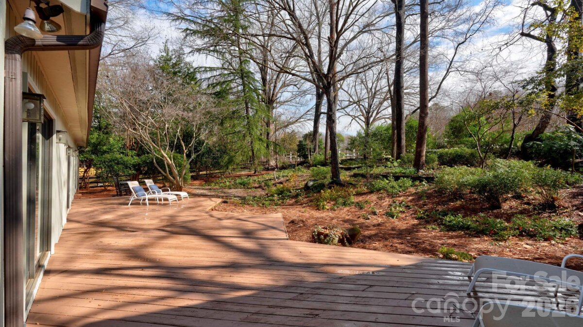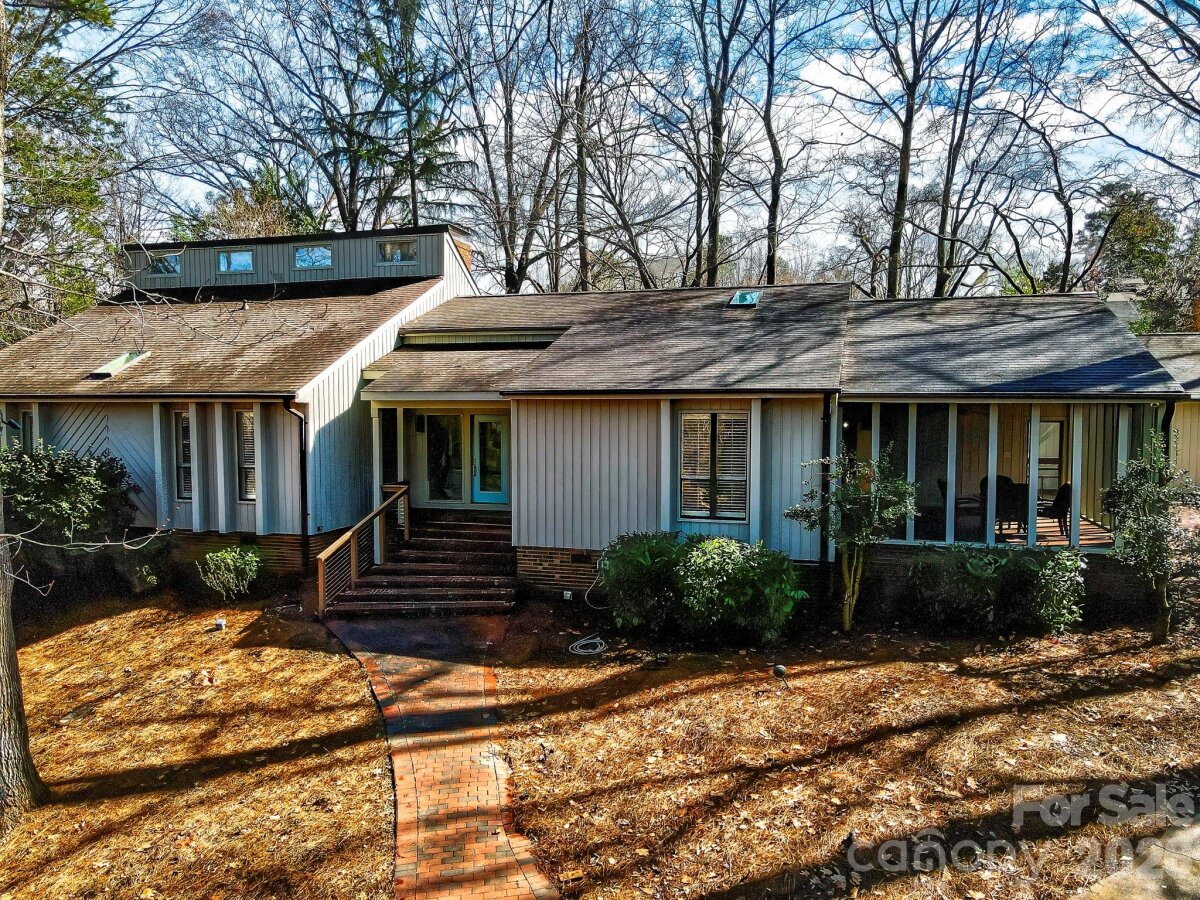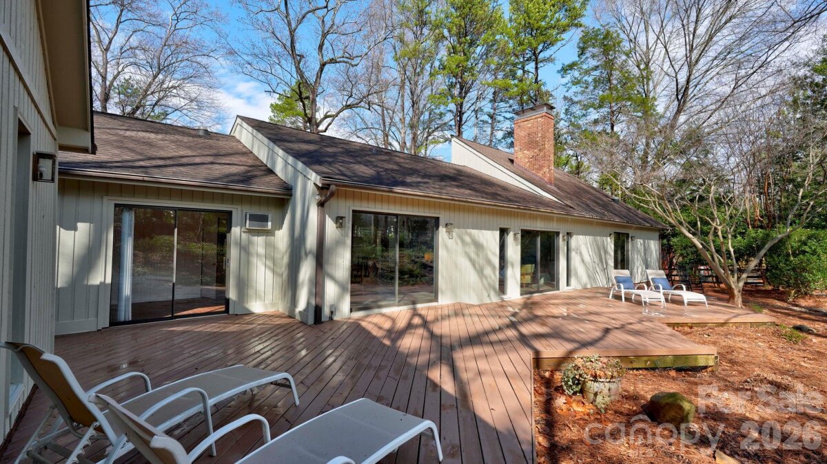 This coveted Raintree classic is ready for its new owner, offered for sale for the first time in 20 years. Situated on a private lot on quiet Waters Point Court, this one-level contemporary has fantastic outdoor spaces, with a back deck/patio spanning the length of the house, plus a 346 square foot screened porch for relaxing and dining al fresco. Freshly painted inside and out, this home has a spacious entry way which leads to the vaulted living room with built-ins and fireplace. It connects to dining, and to the kitchen with granite countertops, island, and breakfast area. A wall of sliding glass doors open to the back deck from the living/dining and from the primary suite, a spacious vaulted bedroom with walk-in closet and large bath. There are two more bedrooms, connected by an updated jack-n-jill bath. There's a storage/flex space (the perfect home office or gym), and a 2-car garage. New carpet in the living areas and bedrooms, and plantation shutters across the front of the house. Located on a cul-de-sac street bordering one of Raintree's lakes, with easy access in and out of the neighborhood via Shallowood Lane to Providence Road. Welcome home!