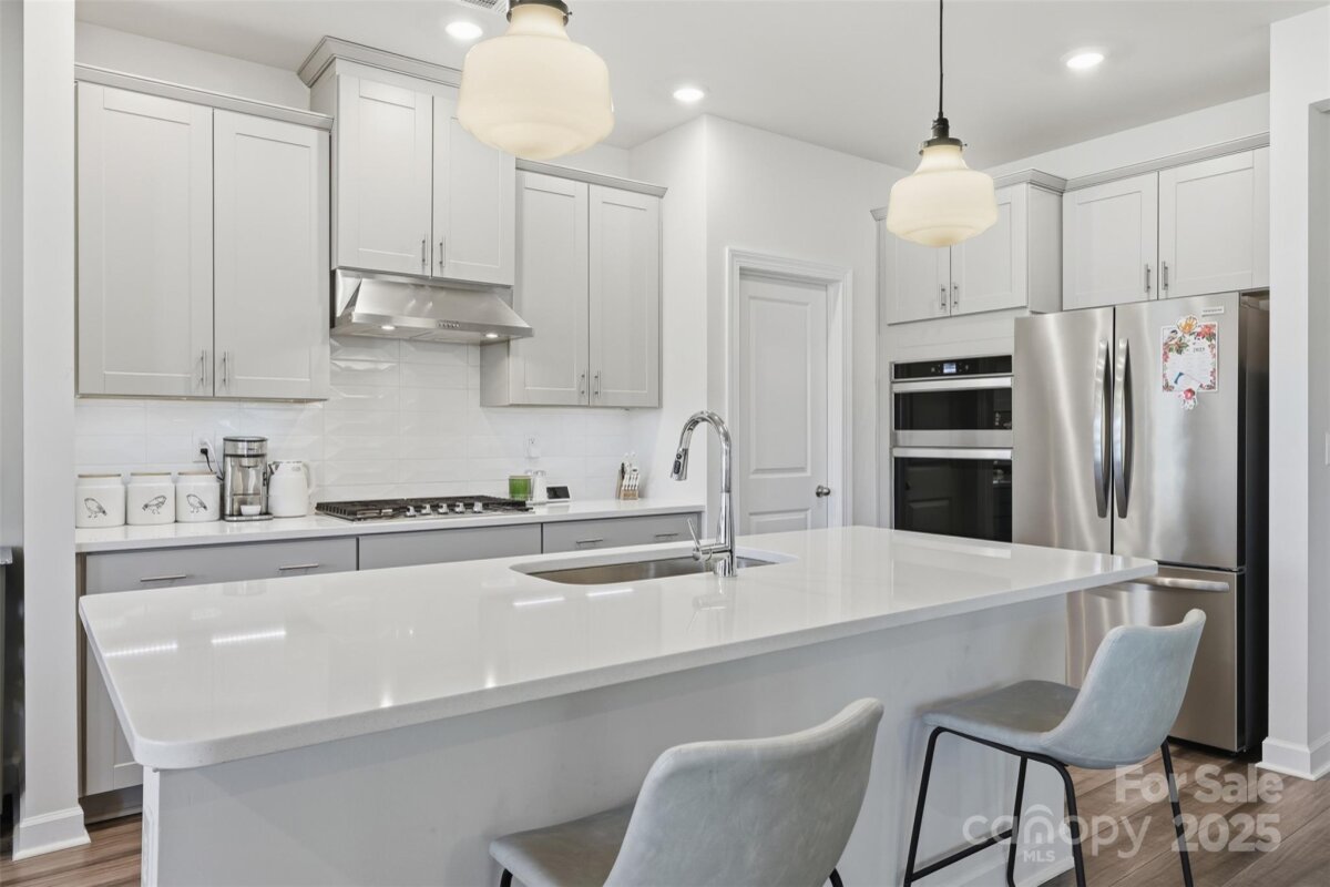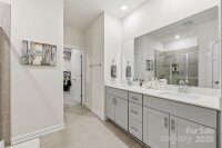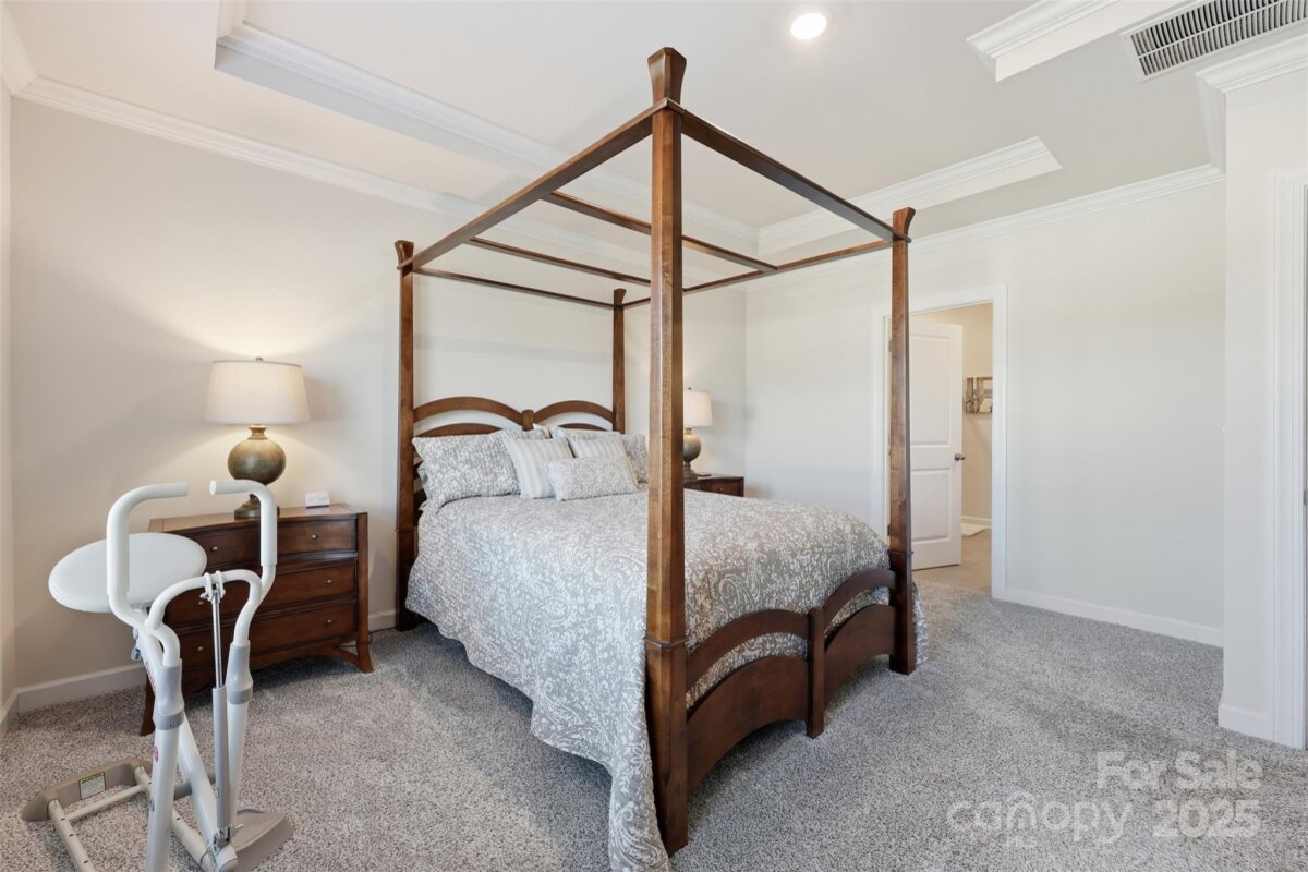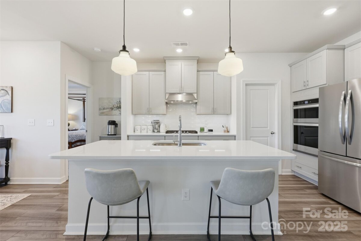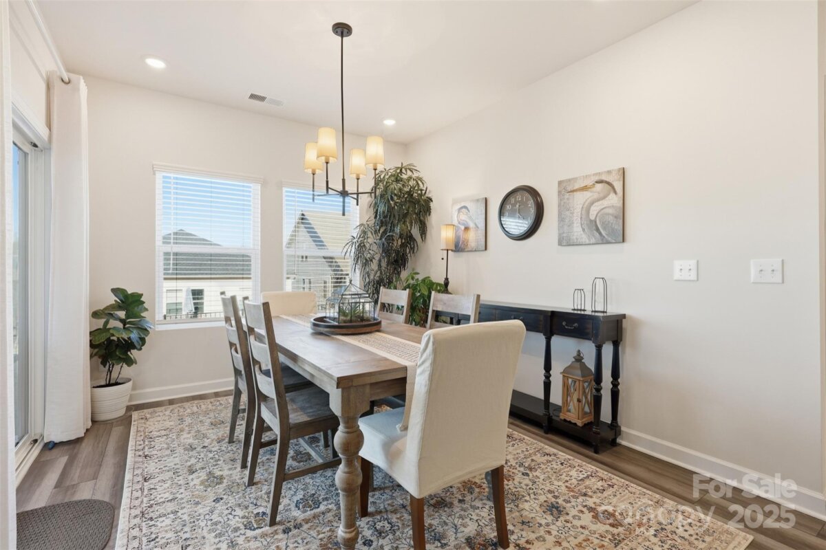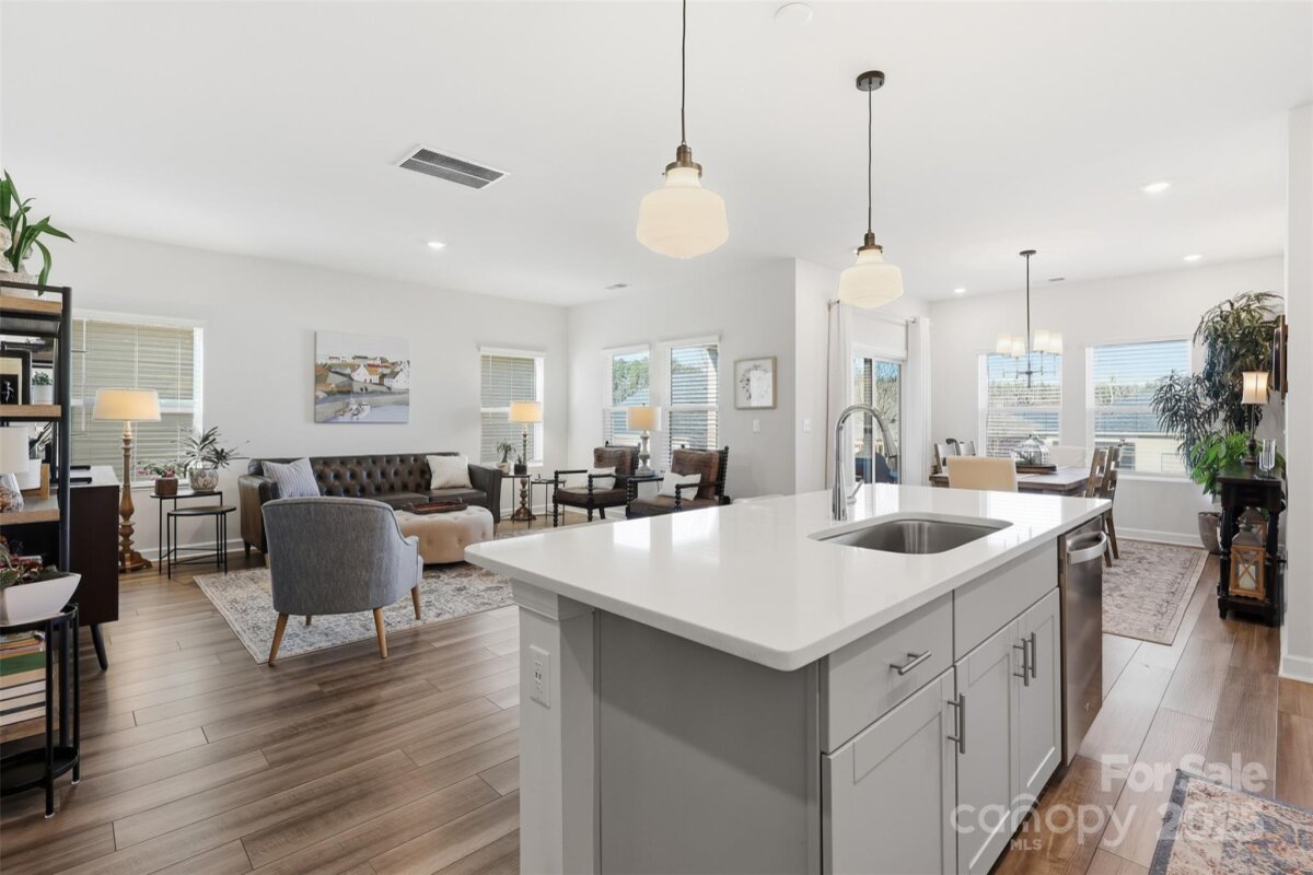 Experience refined living in this immaculate 4 bedroom/3 bath home. Ideally situated within the coveted and amenity-rich Nolen Farms community. A welcoming covered front porch leads into an open-concept main level appointed with beautifully flowing LVP flooring. The sun-filled living and dining areas flow effortlessly into a designer kitchen featuring stylish gray cabinetry, an expansive island ideal for both prep and gathering, a striking backsplash, SS appliances and a generous walk-in pantry. Just beyond the sliding doors, a covered rear patio offers a serene setting for morning coffee or evening unwinding. Privately positioned, the primary suite serves as a true retreat with tray ceilings, a spa-inspired en-suite showcasing a large standalone shower and dual-sink vanity, and a walk-in closet of impressive scale. Two additional main-level bedrooms are well sized and share a beautifully appointed full bath. The upper level enhances functionality with a spacious loft, an additional bedroom and a full bathroom, creating an ideal haven for guests. With lawn maintenance included and an array of community amenities, this home elevates everyday living. Close to Daniel Stowe Botanical Garden, Lake Wylie and vibrant downtown Belmont, this home offers you a thoughtful balance of convenience, natural beauty and neighborhood appeal!