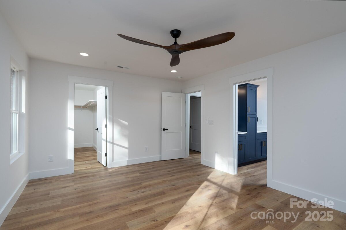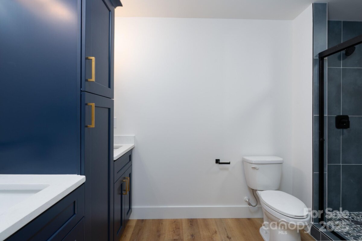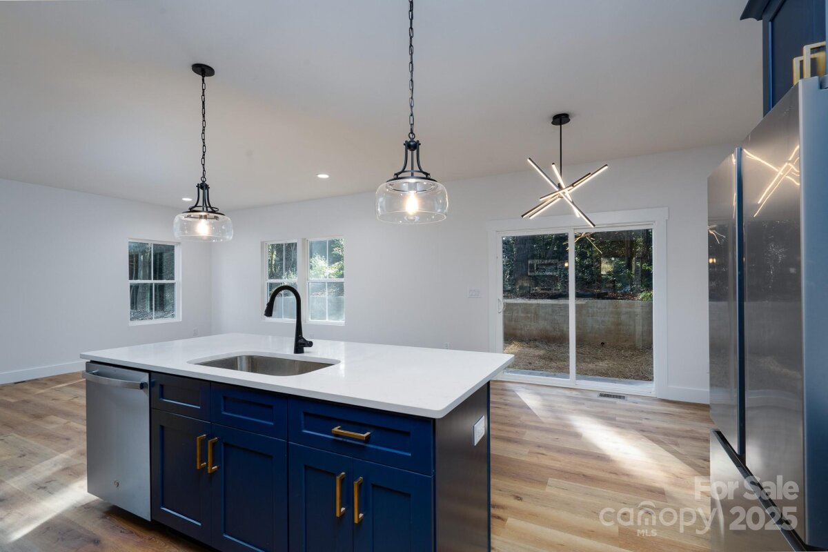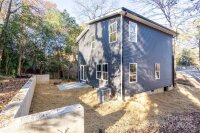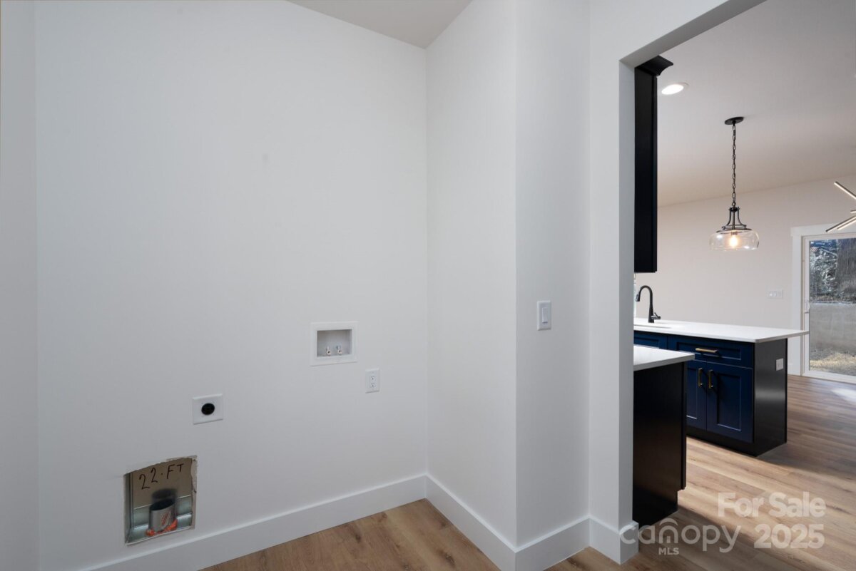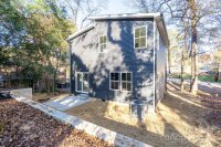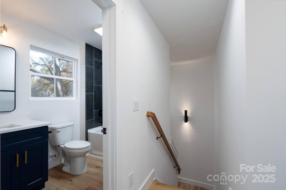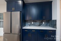 Contemporary 3BR/2.5BA home showcasing an open layout and a large kitchen, custom blue cabinets, and designer tile backsplash. Main-floor laundry for added convenience. The upper level features a spacious primary suite with a walk-in closet and beautifully tiled shower, plus two additional bedrooms and a full bath. Situated on a wooded lot with plenty of shade, this home is Impeccably finished and move-in ready