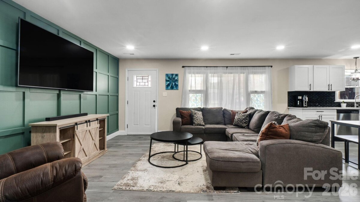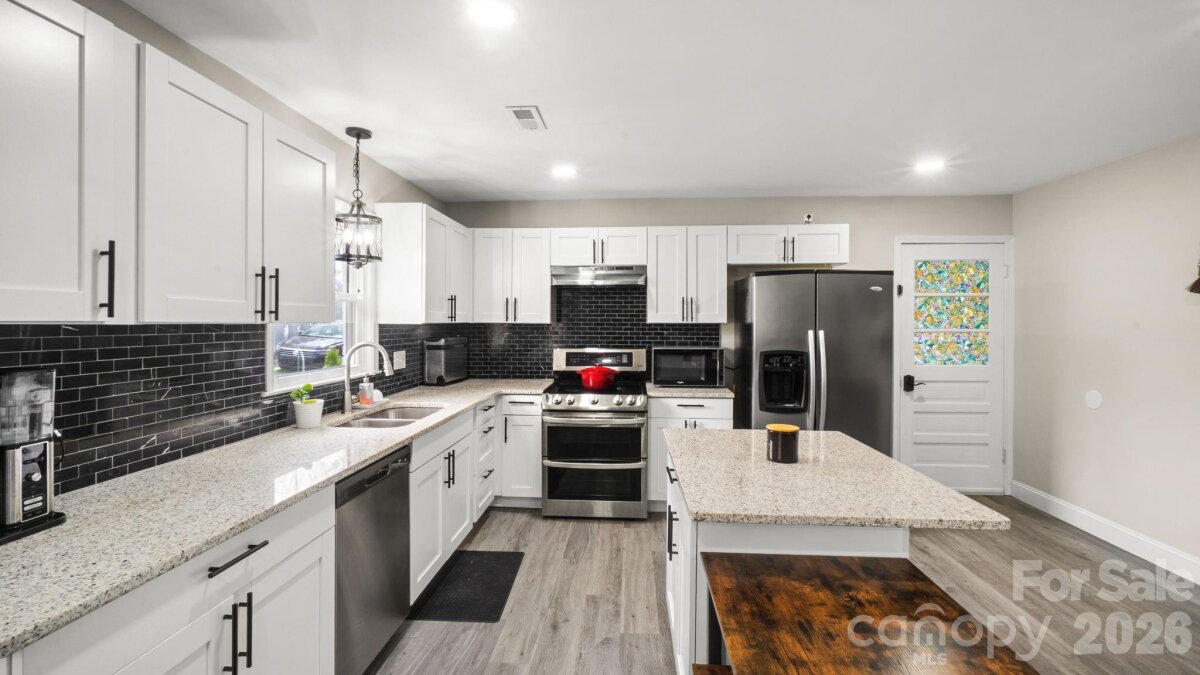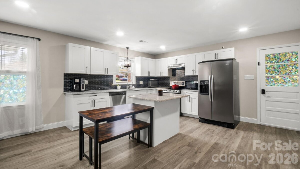 Welcome to this beautifully updated 3-bedroom, 2-bathroom classic brick ranch. This charming home features LVP throughout a split bedroom floor plan, No carpet! Enjoy your morning coffee on the covered front porch, then step inside the open concept living space, that flows into dining and a large kitchen, complete with island and seating. The spacious primary suite has a modern ensuite, and a huge walk-in closet! The second and third bedrooms are generous and have sizeable closets. The updated second full bathroom has great storage, a double-bowl sink, and a tub/shower. Full sized laundry. Step outside to a screened in patio—an ideal setup for entertaining, right off the kitchen. Head out to the outbuilding to see your new flex space: now being used as a gym, imagine the possibilities! The large 0.77 acre, flat, green lot backs to trees. New Roof installed in 2024. NO HOA! It offers the perfect mix of a rural feel while remaining close to everything the Charlotte region has to offer. A five-minute drive to Main Street, Rockwell amenities. 9290 Fisher is located 15 minutes from Salisbury, 20 minutes from Concord, 40 minutes to Uptown Charlotte, 20 minutes to High Rock Lake, and 45 minutes to Lake Norman.