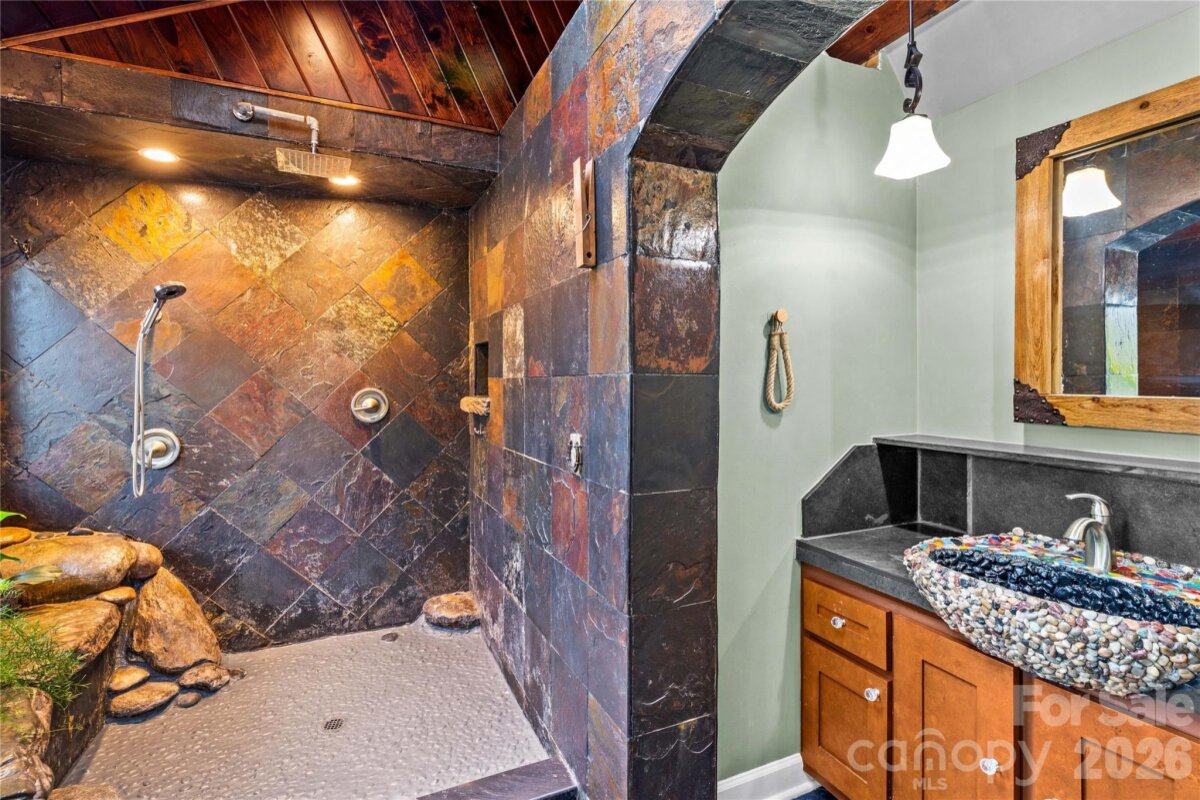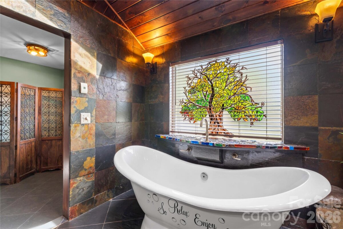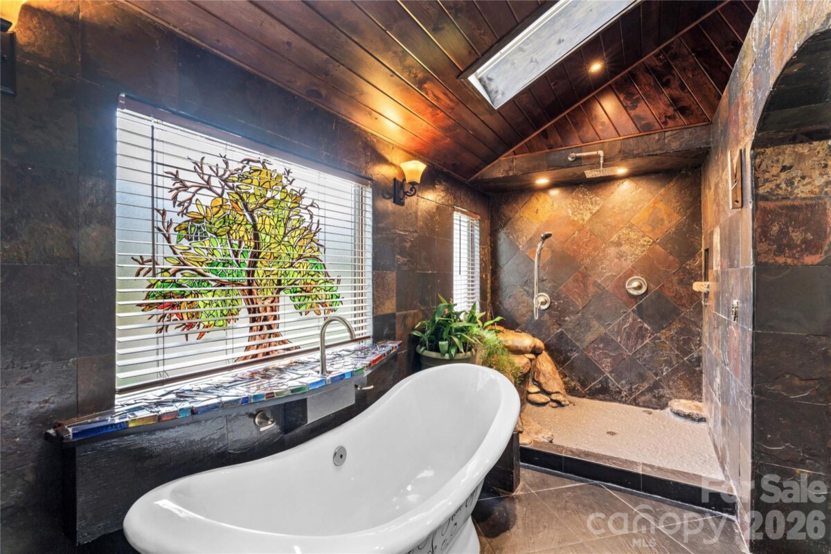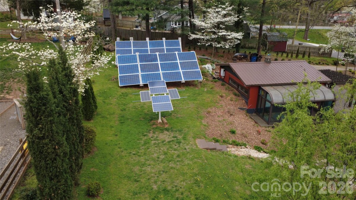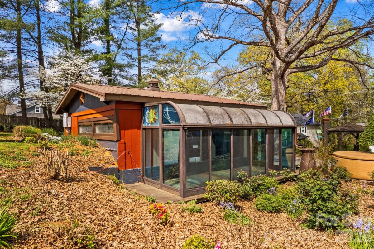 An ultimate engineered sanctuary! This self-sustaining masterpiece of a home is located in the heart of beautiful Statesville, NC! Powered by a 10.0 KW ground-mounted solar grid and paired with a 4-ton heat pump, it offers total climate control and sustainability, along with a lifetime metal roof and engineered rainwater management for a dry foundation and grounds year-round. Step inside to discover exquisite organic textures and refined details throughout. The dining room boasts shiplap ceilings and timber beams, a galley-style kitchen with a breakfast nook, and a spacious dining area for a 10-12 person table. For cozy evenings, snuggle up to the Vermont Castings woodstove, an excellent source of secondary heat and charm. This home is its own wellness retreat, especially with the custom-designed, spa-like primary bath. Enjoy your morning coffee on the glass-enclosed front porch. Downstairs offers endless possibilities, including a second living space perfect for an in-law suite or Airbnb. Outside is an oasis featured in multiple articles, a place you may never want to leave! The detached garage provides vehicle storage, workshop space, greenhouse capabilities, and more. The photos say it all—come see this hidden jewel before it’s gone! You’ll love the location, just a short walk to charming Downtown Statesville, pickleball and tennis courts, with quick access to I-77 and I-40!