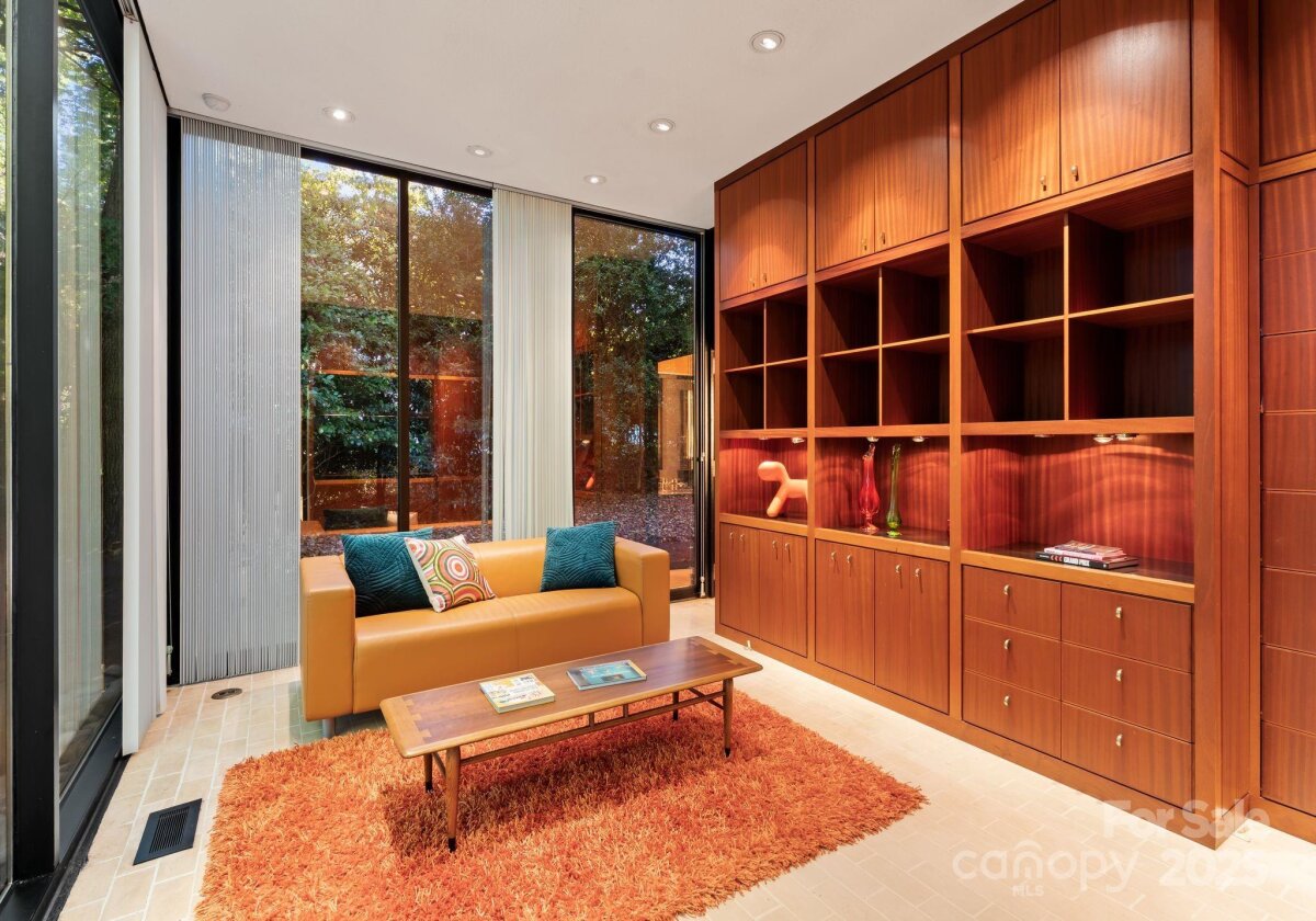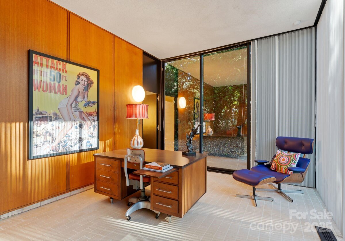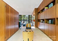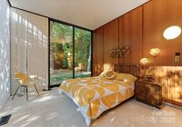 The Bates Glass House, circa 1960, was designed by prominent Charlotte architect Charles Bates as his family home, drawing inspiration from Philip Johnson's iconic New Canaan, Connecticut Glass House built a decade prior. The avant-garde nature of steel and glass pavilion homes from the mid-century era contribute to their rarity both locally and nationally. As much a work of art as it is a residence, The Bates Glass House is one of few Charlotte residences which can claim elite Trophy Property status. Nestled on a serene wooded lot overlooking a pond in what was once rural Charlotte, the residence today is centrally located in our expanding city, yet still retains its original sense of seclusion. The interior teak wall panels and built-ins combined with terrazzo brick flooring create a warm and balanced aesthetic juxtaposed to the glass and steel facade. Seamless integration with the natural surroundings extends a soothing connection to the natural world. The Bates Glass House is truly exceptional in every way. Stay tuned for additional photos to be released throughout the week leading up to Active status on Friday October 17th. This home is expertly staged by Charlotte Vintage with over 50 pieces of period authentic vintage furnishings and decor, all of which are for sale.