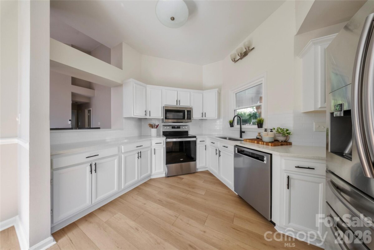 If you’ve been waiting for an updated, move-in ready home this is it. Welcome to 9600 Lawley Lane, a 3-bedroom, 2-bath home featuring vaulted ceilings, abundant natural light, and an open layout that feels both spacious and inviting. Offering the perfect blend of style, comfort, and peace of mind. The kitchen has been upgraded with quartz countertops and Samsung smart refrigerator, while the main living area features a custom fireplace with new mantle and tile surround (2023). Both bathrooms have been updated with new vanities, and the primary suite includes a newly installed shower (2025). Major improvements include new windows and French doors (2022), new flooring and interior paint (2022), new siding and exterior paint (2023), and a new fence (2023). Step outside to a fully fenced backyard with updated landscaping and a freshly painted deck, perfect for relaxing or entertaining. Custom cedar columns and a cedar mailbox enhance the home’s curb appeal. Smart home features include a Samsung Smart Home Hub, keyless entry, Blink Security System with 7 cameras and Nest thermostat. The neighborhood has parks, walking trails, and direct access to the greenway, this home offers both convenience and lifestyle. Updated, move-in ready, and ideally located—homes like this don’t last long.