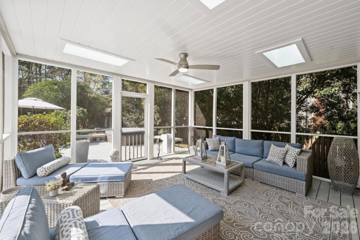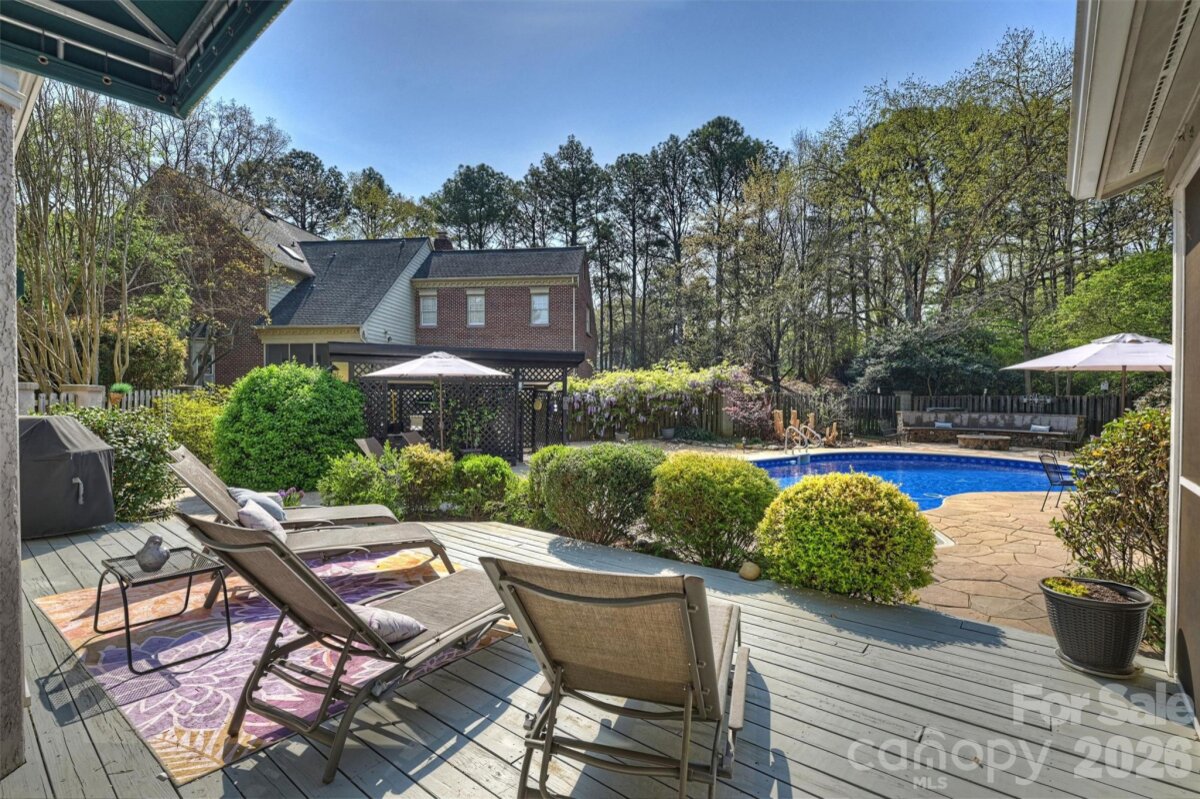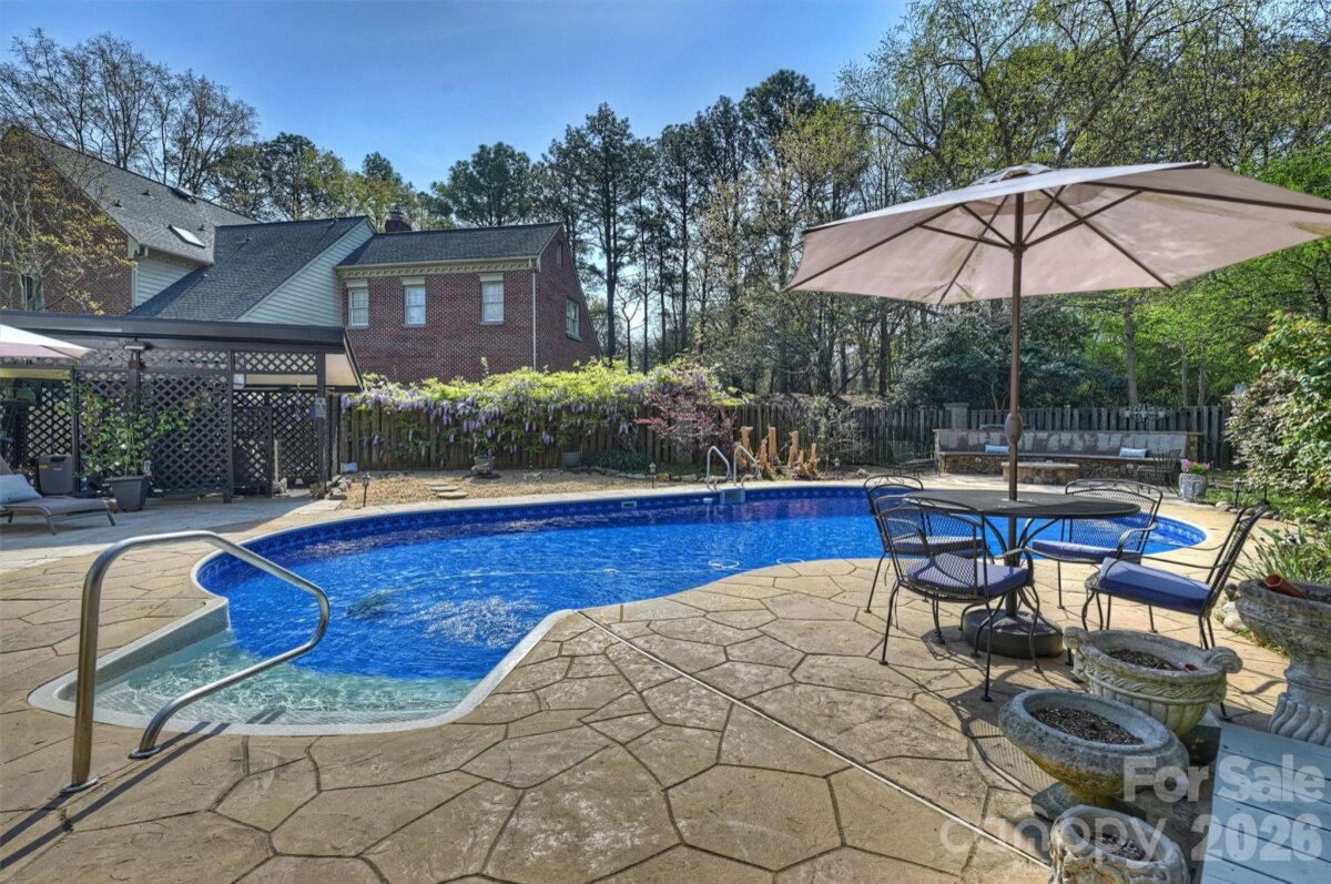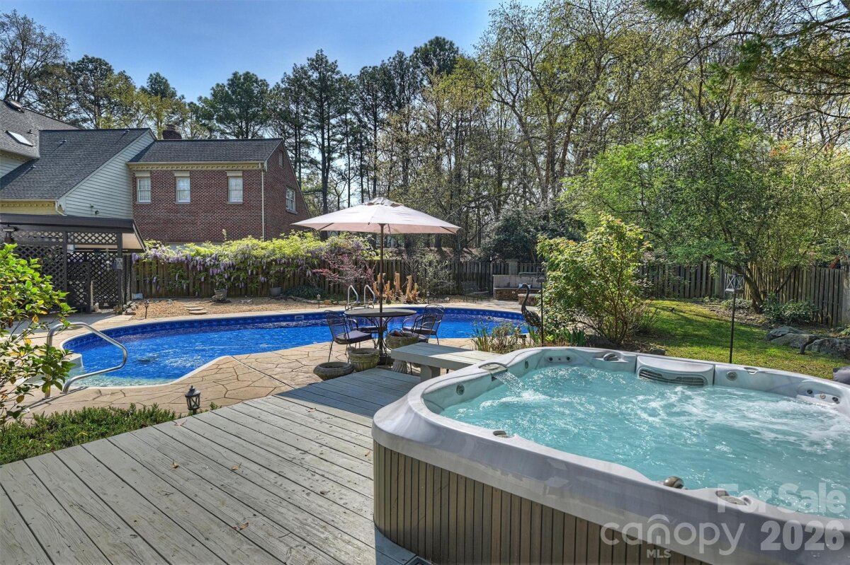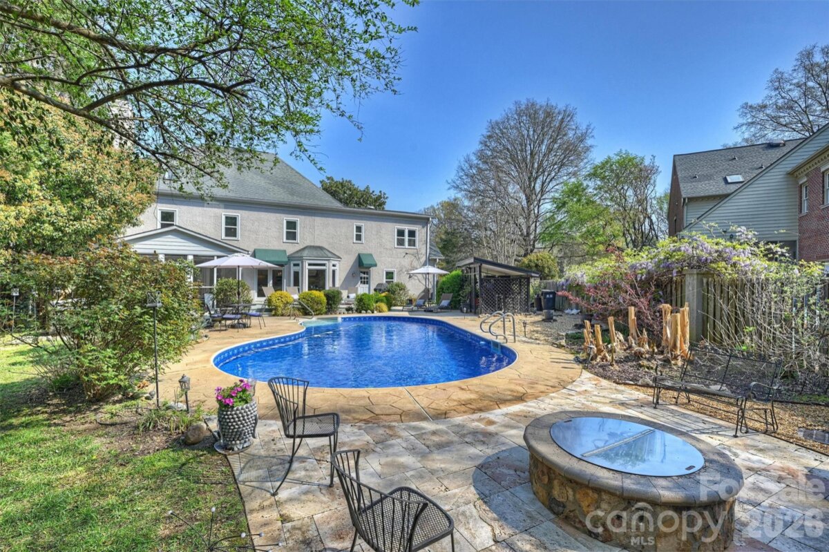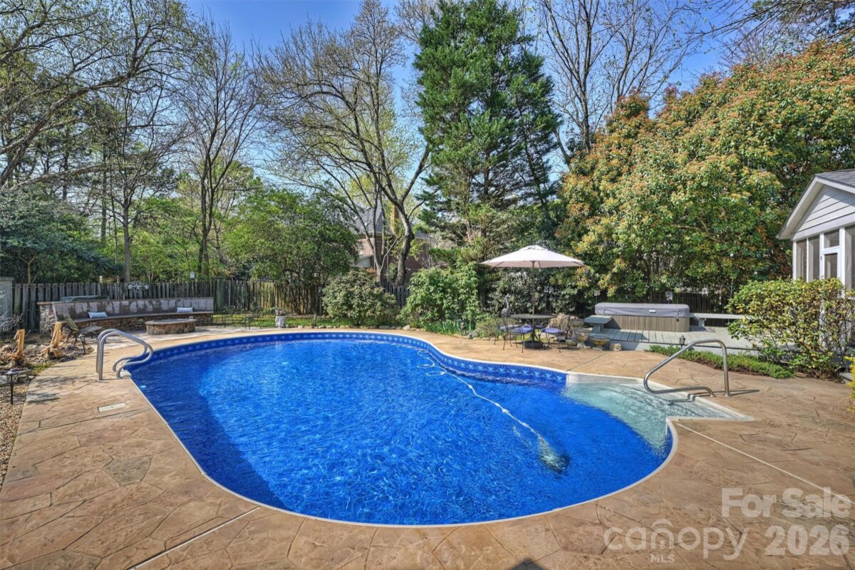 Welcome home to your private oasis! Nestled in the Balmoral neighborhood of Park Crossing this stunning home features beautiful hardwood floors, coffered ceiling, elegant wainscoting, dental crown molding throughout the downstairs and a gorgeous kitchen which overlooks the dreamy private backyard. There you will find a large inviting inground heated pool, colorful mature plants and a firepit for those evening storytelling times. Relax on your comfortable screened-in porch or soothe those muscles in the nearby Jacuzzi hot tub. The primary bathroom includes an incredible ThermaSol sauna steam shower and a high towering ceiling well lit by the skylight overhead. The primary walk-in closet is massive and has lots of natural light penetrating through the window located inside. A fixed staircase leads up to a large attic with tons of storage space - no pulldown stairs! All windows throughout the house were replaced in 2022. Park Crossing is one of Charlotte's most desirable neighborhoods for so many reasons. Residents enjoy access to the Little Sugar Creek Greenway to enjoy a peaceful stroll or hearty run through the beautiful natural areas. Conveniently located close to Southpark and just minutes from I-485.