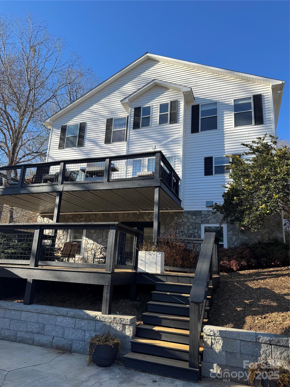 Welcome to your private lakeside retreat. This beautifully maintained home offers the perfect blend of comfort and outdoor living. Step inside to find a customized garage, along with a spacious kitchen, living room, and dining room designed for both everyday living and entertaining. A convenient half bath completes the first floor, while just off the main living area, a generous deck provides an ideal setting for gatherings, grilling, or simply enjoying the peaceful surroundings. Out front, the inviting covered porch offers a peaceful spot to sip your morning coffee or enjoy a book in the afternoon. Upstairs, the home features three bedrooms, including a serene primary suite with lake views, a private en-suite bathroom, and a walk-in closet—your own personal escape at the end of the day. The finished basement expands the living space even further, offering a dedicated storage room, ample space for entertainment, and a stylish bar complete with a refrigerator and sink. A full bathroom and a private exterior entrance make this level perfect for hosting guests down by the water. Step outside to enjoy multiple outdoor entertainment areas, including a charming gazebo, plenty of space for outdoor seating, and a floating dock with additional room to relax and soak up the sun right on the water. Whether boating, swimming, or simply unwinding lakeside, this home delivers the ultimate waterfront lifestyle. This is lake living at its finest—indoors and out.
