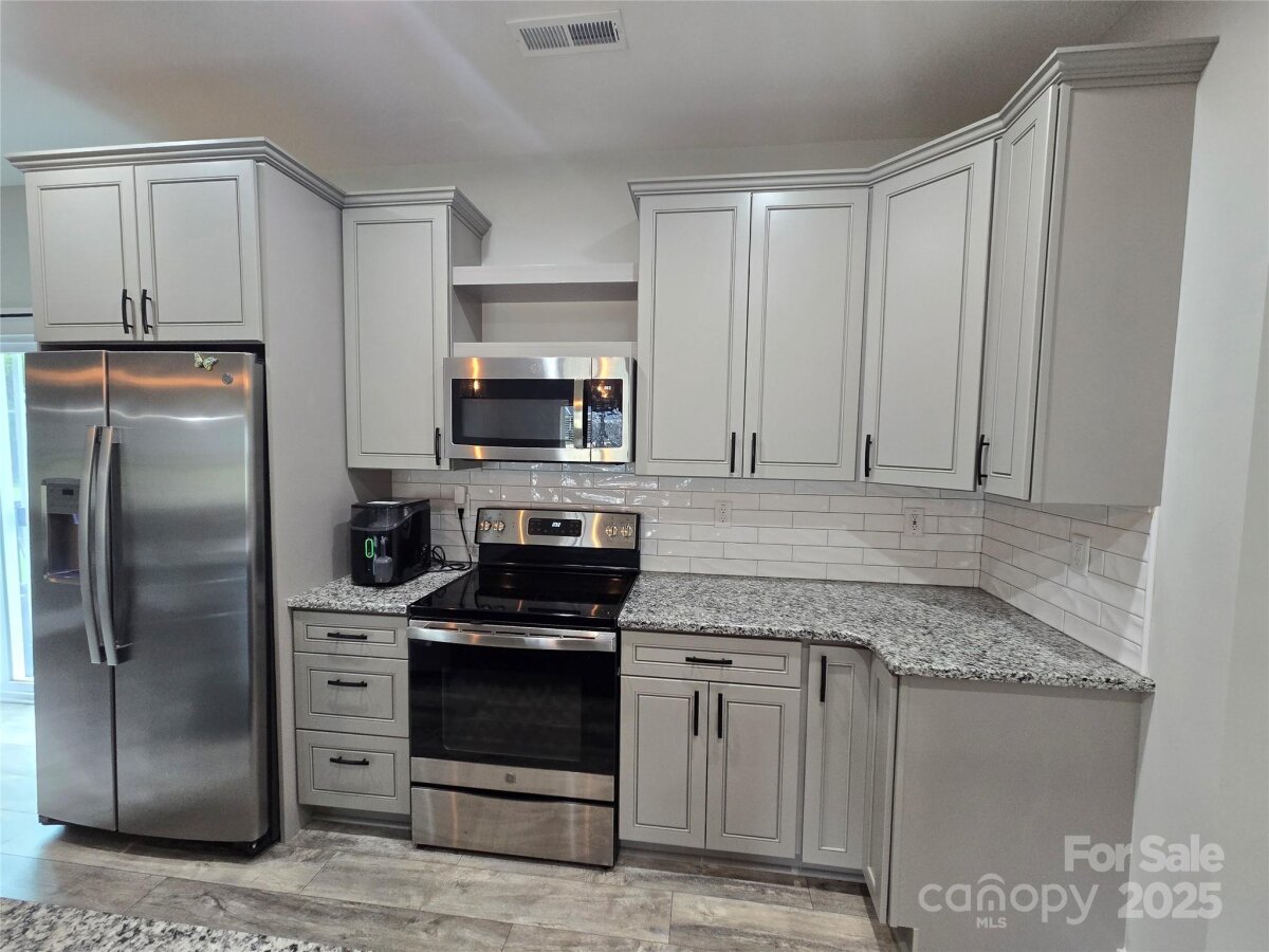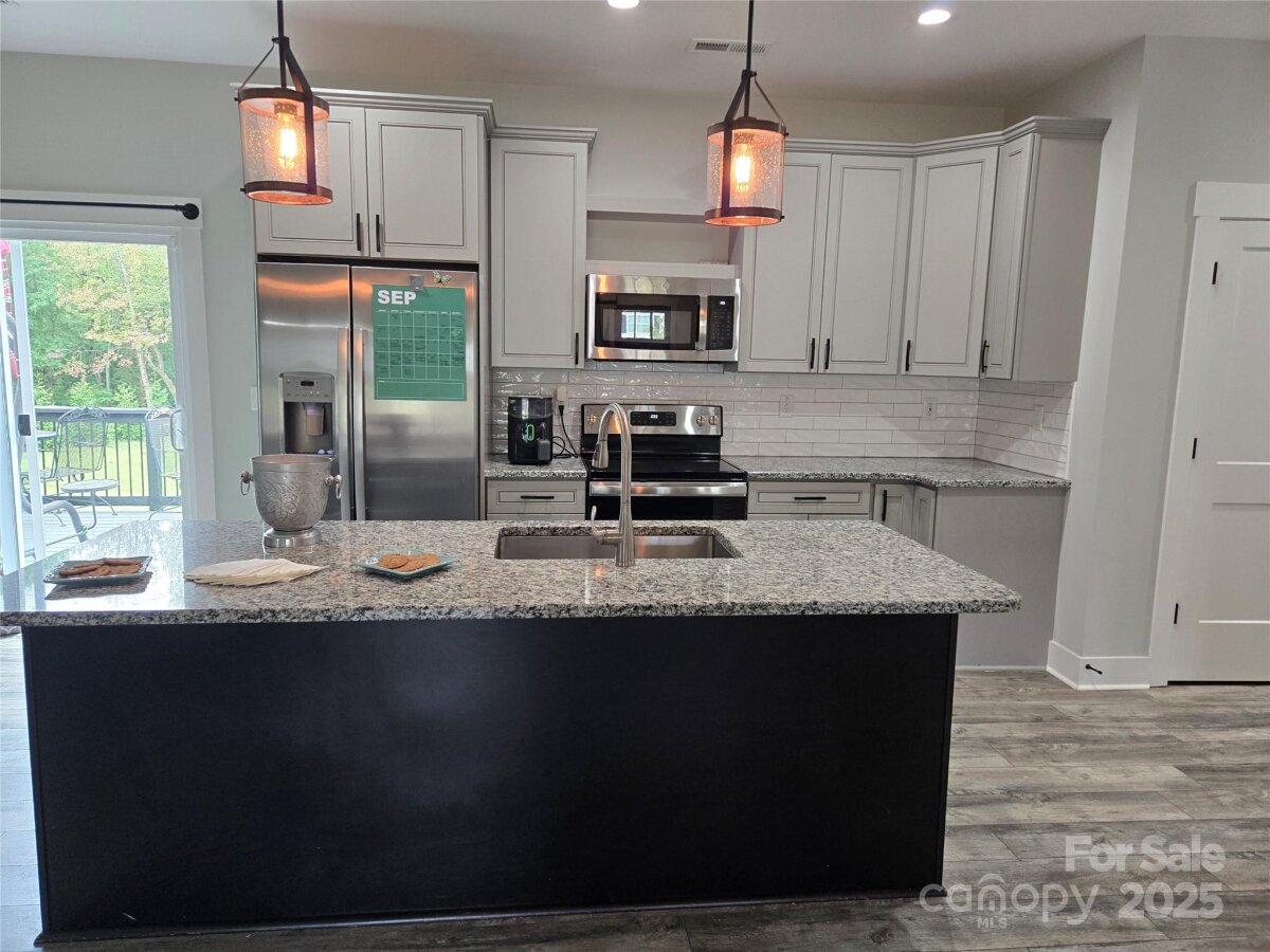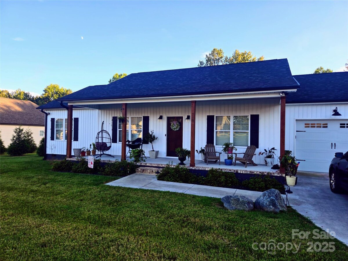 Single story living at its best with an amazing open floor plan. Stainless appliances, solid surface countertops and a large pantry are highlights of the beautiful kitchen. This home offers luxury vinyl plank flooring and a split bedroom plan with a spacious primary closet. Do NOT miss the outdoor living space. Approximately 12x16 composite deck overlooks huge private backyard and the large rocking chair front porch is waiting for your special touch. Large oversized garage for your bigger vehicles and a gravel parking area for those that are extra large. Bonus: prewired for generator!